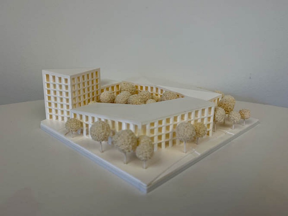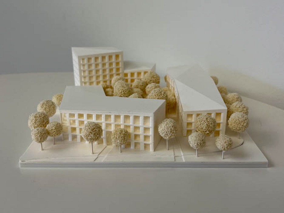 Die städtebauliche Figur des Entwurfes orientiert sich am räumlichen Konzept des Freiburger Weingartens. Die Dimensionierung der Gebäudekörper nimmt die Geschossigkeit und Tiefe der umliegenden achtgeschossigen Zeilenbauten auf. Der kompakte Baukörper ist zeitgemäß als Modulbau entwickelt und lässt sich somit in extrem kurzer Bauzeit erstellen. Das Freianlagenkonzept folgt dem Prinzip „Haus im Park“. Die geschwungene Linienführung und organische Formensprache bilden einen spannenden Kontrast zu den hochbaulichen Strukturen und erzeugen ein facettenreiches und qualitätsvolles Raumgefüge mit eigenständiger Identität.