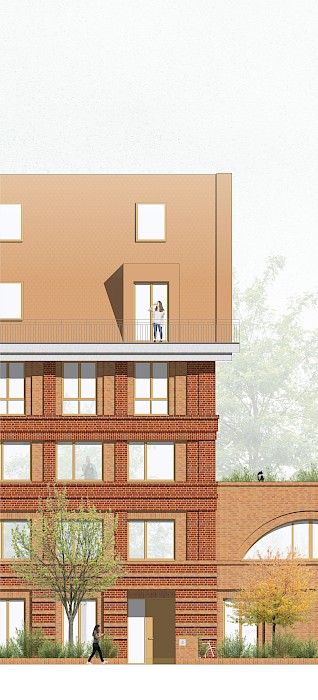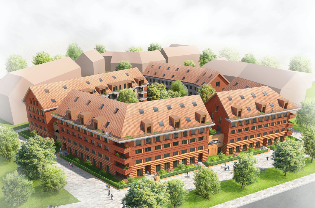 Der Entwurf von Stefan Forster sieht die barrierefreie Erschließung der acht Häuser direkt von der Straße aus vor. Die als 3-5-Spänner konzipierten Häuser orientieren sich farblich an der Farbigkeit der umliegenden, historischen Gebäude. Die Wahl der Baumaterialien garantiert ein nachhaltiges, langlebiges Gebäude und trägt so gemeinsam mit der Fassadenbegrünung und weiteren energetischen Maßnahmen zur Entwicklung des neuen nachhaltigen Stadtquartiers bei.