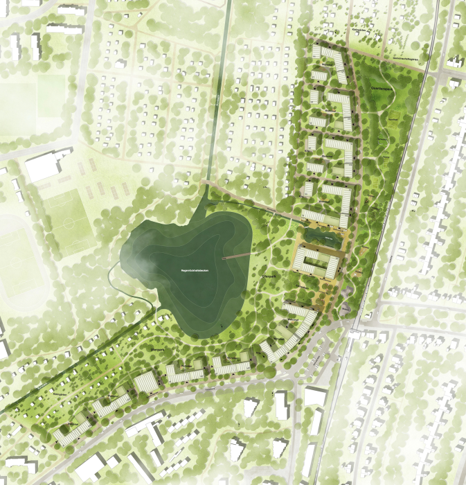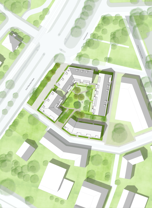 Unser Entwurf sieht fünf 3- bis 4-geschossige Häuser sowie einen 7-geschossigen Hochpunkt vor. Die monolithisch anmutenden Baukörper sind nach dem Prinzip „Haus im Garten“ locker im parkartigen Grünraum gruppiert. Ihr strenges Fassadenraster steht in bewusstem Kontrast zu den Knicken und Faltungen der Baukörper; ein Prinzip, dass sich in der Abwicklung der Dachlandschaft wiederfindet. Das energetische Konzept basiert auf einer Kombination von massiven Außenwänden aus gedämmtem Mauerwerk mit so wenig gebäudetechnischer Unterstützung wie möglich, und der aktiven Erzeugung regenerativer Energie mittels Erdwärme und Photovoltaik.