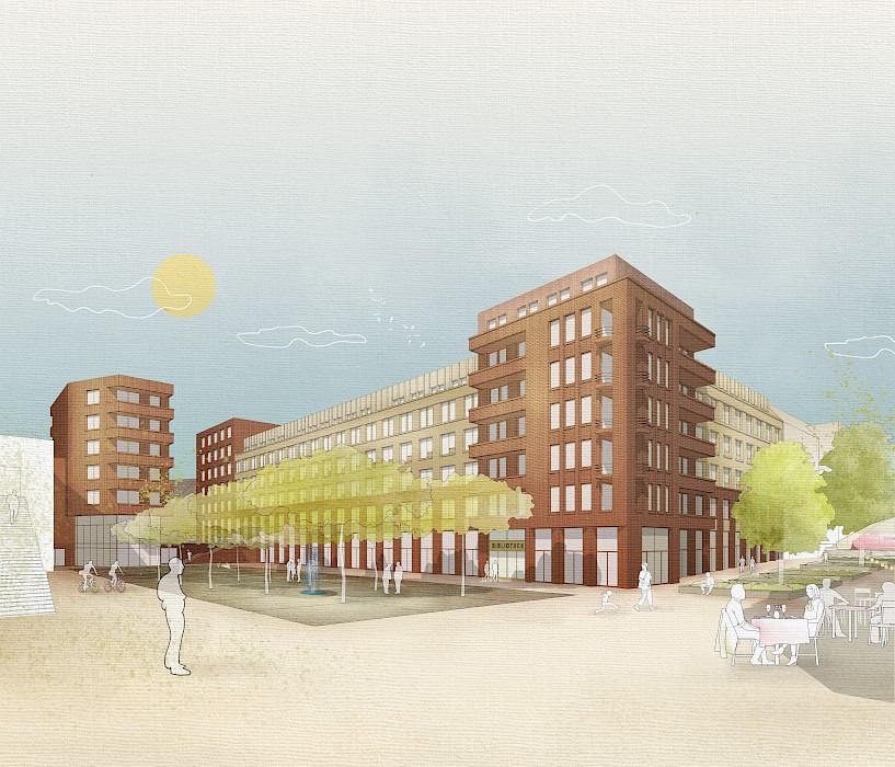Das Grundstück soll mit Wohnraum, pflegenahem Wohnen, einer Stadtteilbibliothek sowie verschiedenen Gewerbeeinheiten bebaut werden. Dabei soll die Planung des Quartiersplatzes, dessen Funktion als Wochenmarkt maßgebend ist, einen bedeutenden Teil der Gesamtentwicklung ausmachen.
