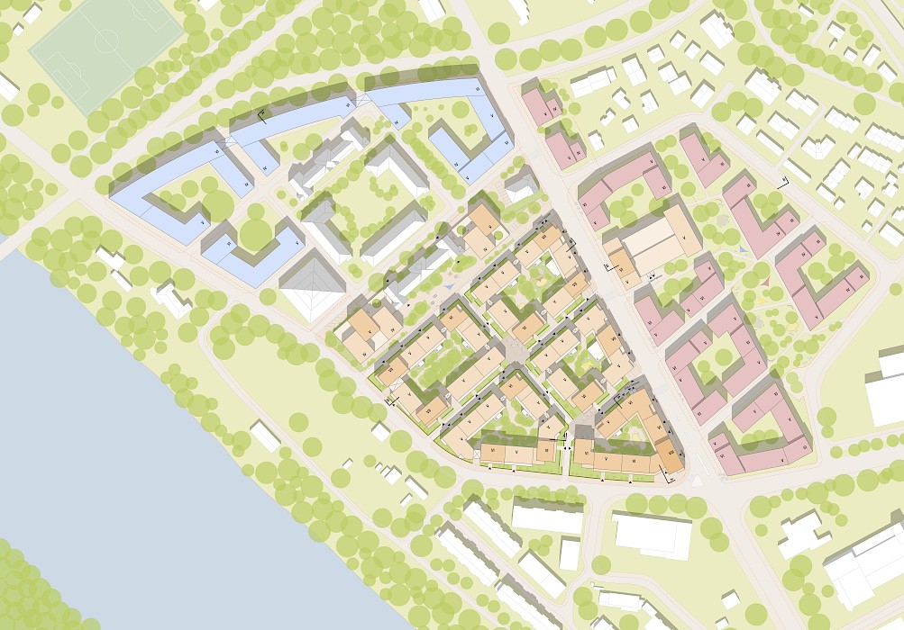 Der Entwurf orientiert sich am Leitbild der europäischen Stadt mit der eindeutigen Differenzierung zwischen öffentlichem und privatem Raum. Kernpunkt dieses Stadtmodells sind Wohnblöcke welche, zur besseren Durchlüftung, mit Öffnungen versehen sind. Die Höhenstaffelung des Blockrandes dient der weiteren Differenzierung und Identifikation. Der neue Stadtteil ist autofrei der öffentliche Raum erhält dadurch eine besondere Bedeutung und wird detailliert ausgeführt.