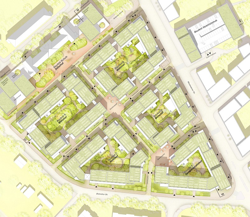 Das autofreie Quartier ist als Quartier der kurzen Wege geplant. Ein enges Netz von schmalen Straßen umfährt die einzelnen Wohnquartiere. Die gewählte offene Blockstruktur schafft zudem Abkürzungen durch die halböffentlichen Innenhöfe. Es entstehen Blickbezüge zwischen den Höfen, ähnlich dem dörflichen Vorbild.