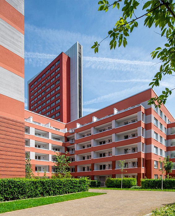 Wir freuen uns und sind sehr stolz für das Stadthaus Schloßstraße in Frankfurt die renommierte Martin-Elsaesser-Plakette des Bundes Deutscher Architekten im Land Hessen erhalten zu haben. Das Wohnhaus mit Kita ersetzt einen überwiegend gastronomisch genutzten Flachbau in Frankfurt-Bockenheim. Der Neubau reagiert auf die städtebauliche Situation zwischen der Straße und dem Bernuspark, dessen Eingang er mit seiner leuchtendroten Klinkerfassade markiert.