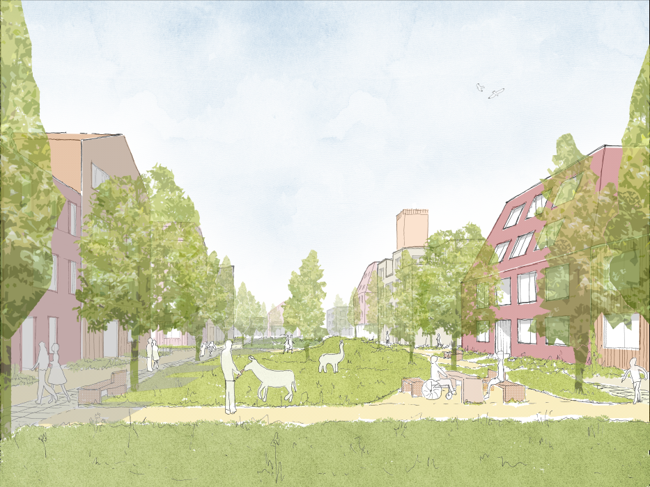 Innerhalb des Entwurfsgebiets bleiben die erhaltenswerten Bausubstanzen im inklusiven Quartier bestehen. Dadurch erhöht sich der Identifikationscharakter des Quartiers und die eingesetzte graue Energie bleibt erhalten. Als regelmäßiges Baufeldraster entsteht das neue Wohnquartier. Ein Wegenetz verbindet die Wohnhöfe miteinander und verzahnt diese mit den umliegenden Sonderbauten und stellt die Verbindung zu Orschel-Hagen her. Die zwei Hochpunkte des Bestandes bleiben als Landmarks erhalten. Die Wohngebäude sind abwechselnd in der Höhe gestaffelt. Die Blockstrukturen werden kleinteilig gegliedert und nach dem dörflichen Vorbild in Einzelhäuser unterteilt. Die Durchmischung der Gebäude, Wohnformen und Nutzungen erzeugt einen urbanen Dorfcharakter.