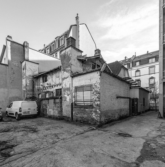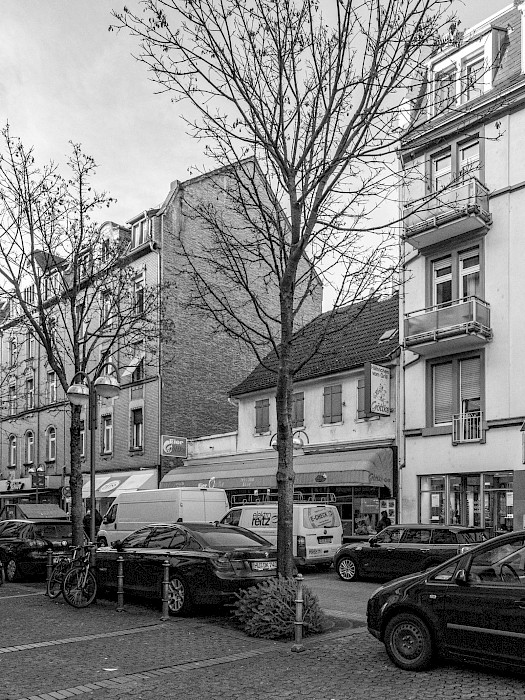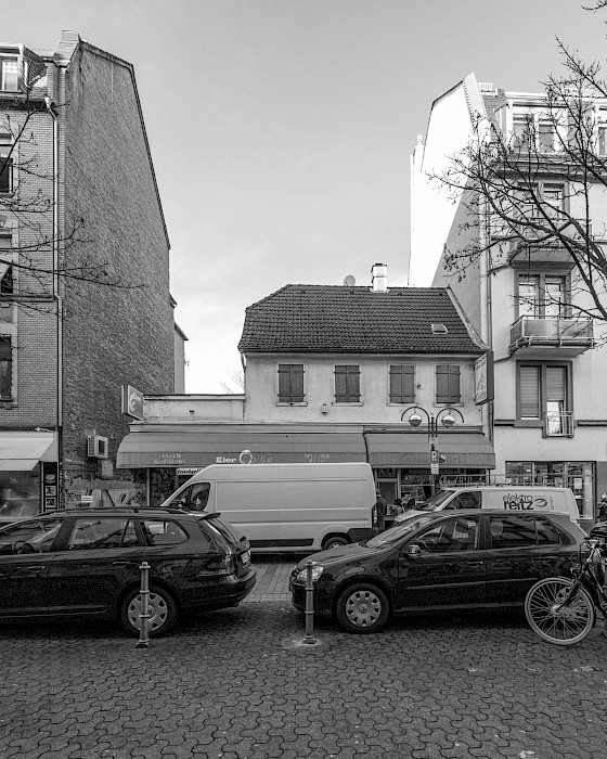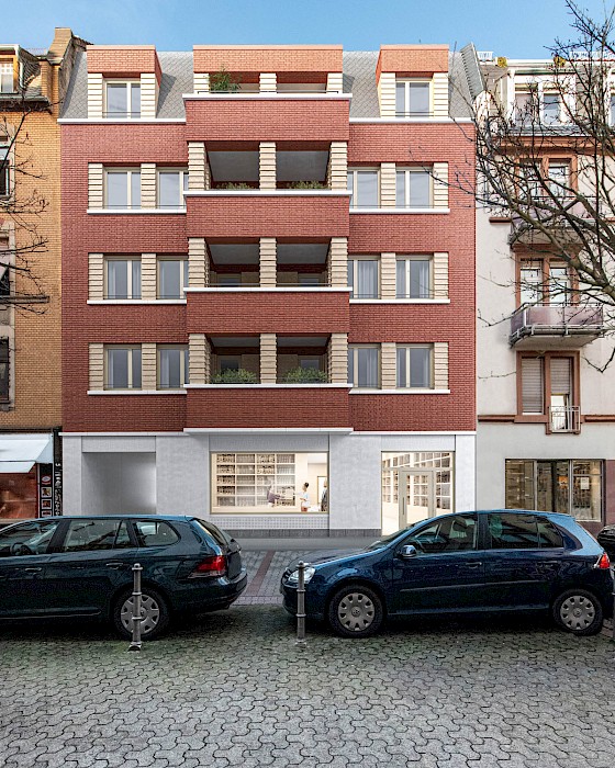 Berger Straße is a long and bustling street in the centre of Frankfurt am Main. This new building, in the middle section of the street, in the district of Bornheim, will provide five apartments, a shop on the ground floor and six commercial units. It closes a gap in the line of mostly late 19th-century buildings. The design of the new building is derived from an analysis of the existing development, and is therefore divided classically into a front section, side wings and a rear building. This arrangement gives rise to small courtyards on both sides, adjacent to the neighbouring buildings.