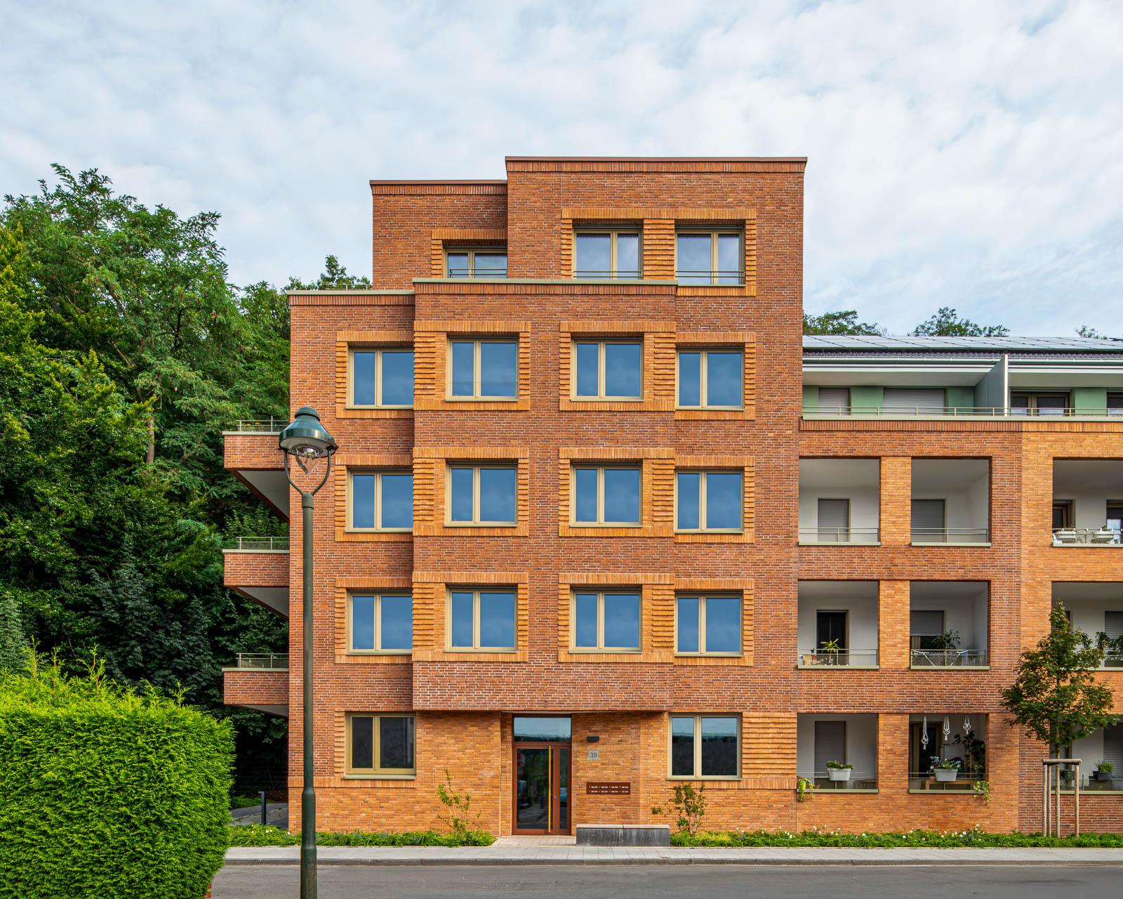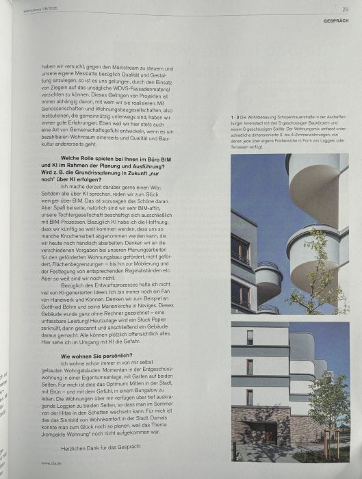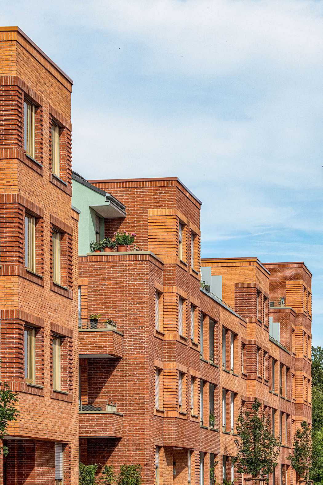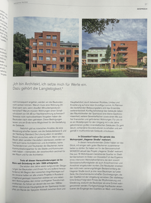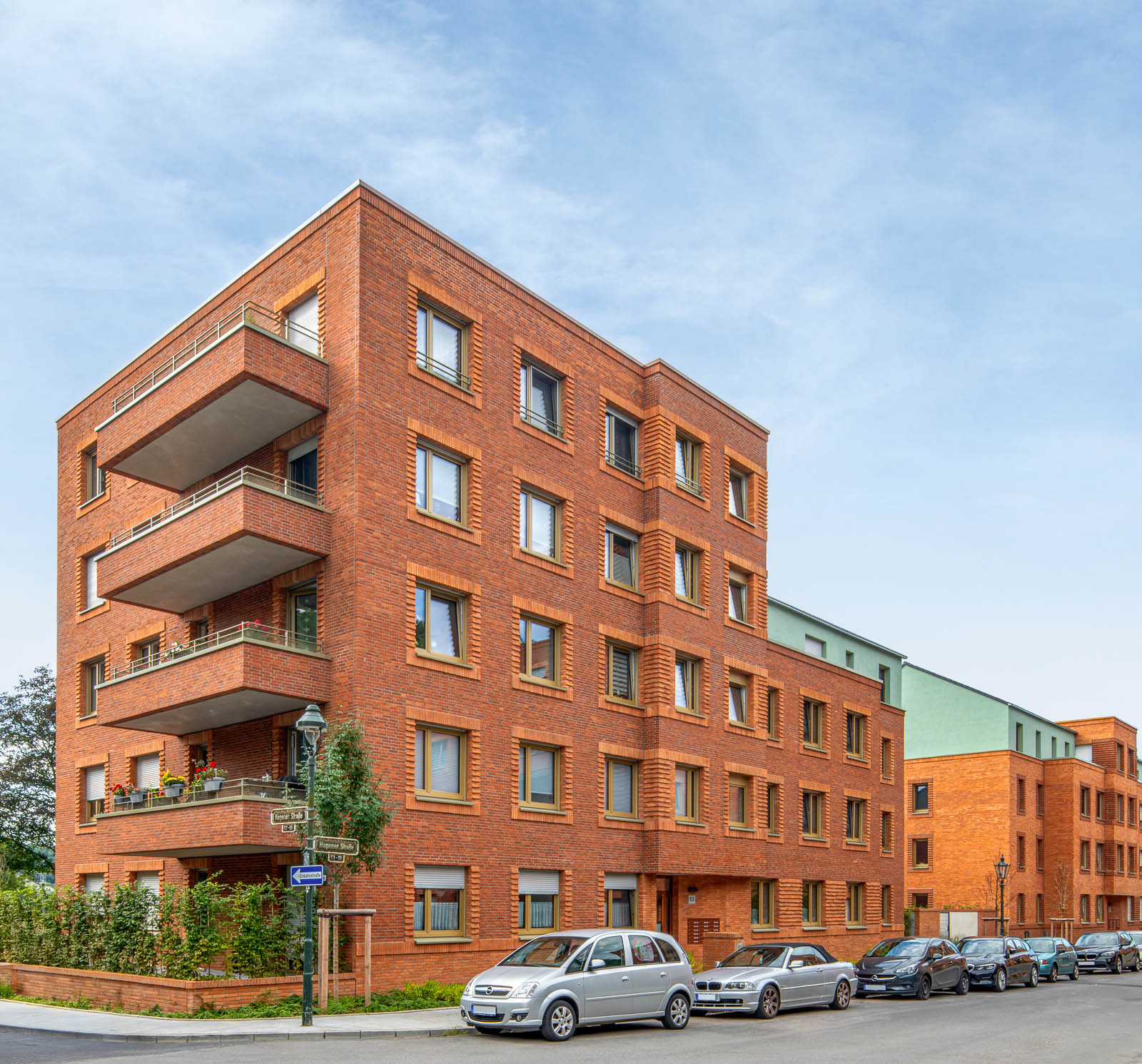 In einer aktuellen Meldung präsentiert das Architekturportal BauNetz unsere Wohnquartier in Düsseldorf: „An den Fassaden zur Straße arbeiteten die Architekt*innen mit einer zweischaligen Vollklinkerfassade mit porosierten Lochziegeln als Dämmung. Flache Erker und ein Staffelgeschoss gliedern die Straßenansicht plastisch. Hinzu kommen auffällige Streifenreliefs sowie changierende Farben der Klinker.“
