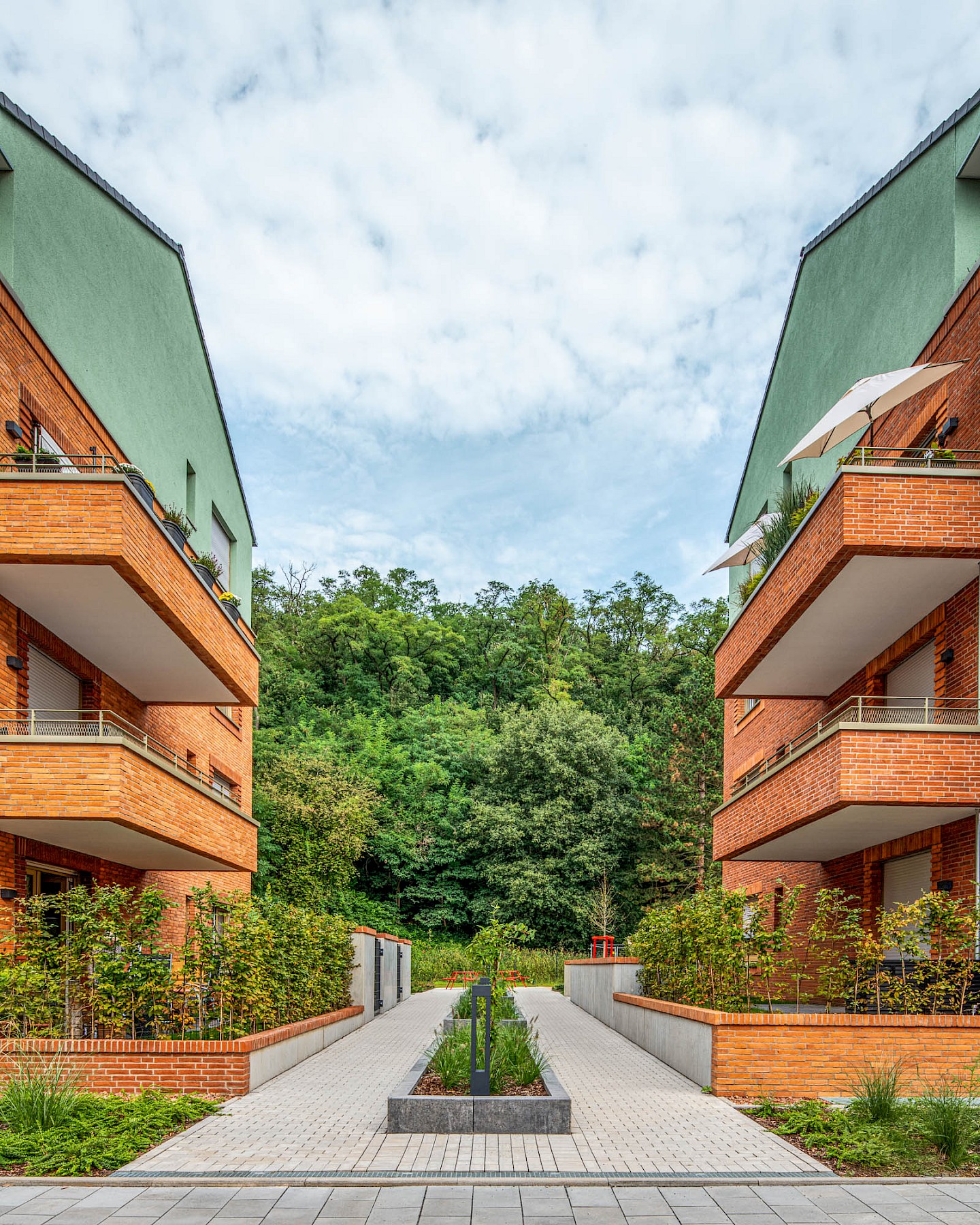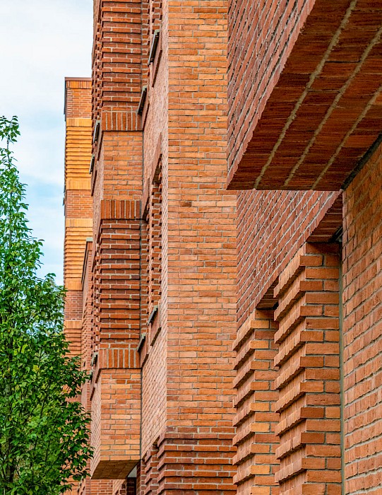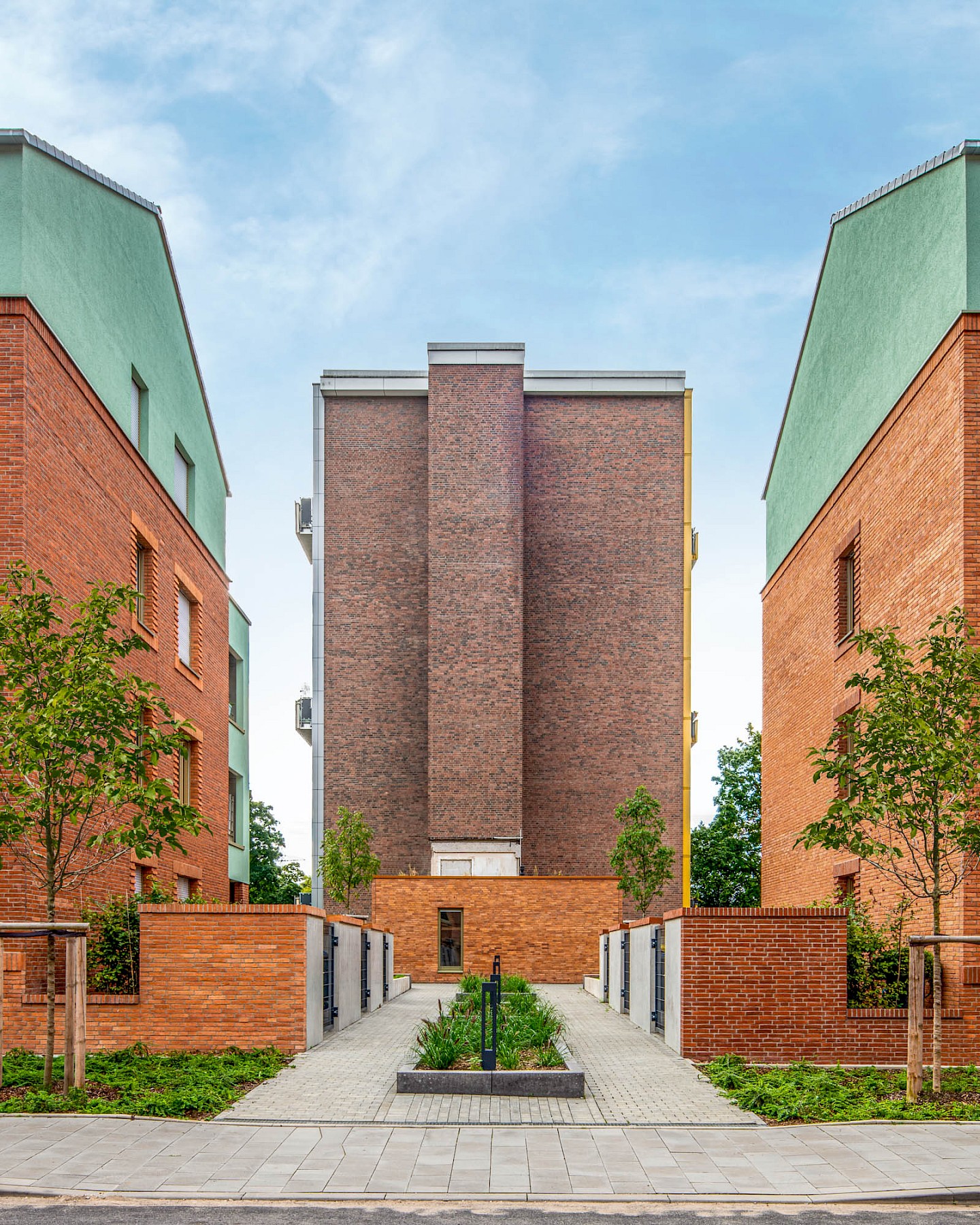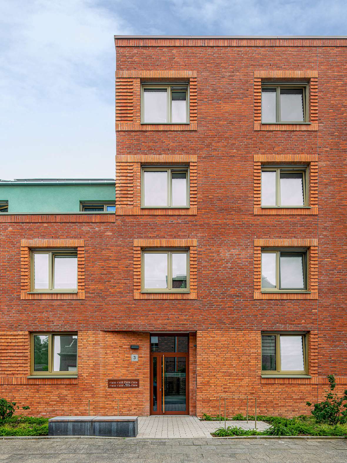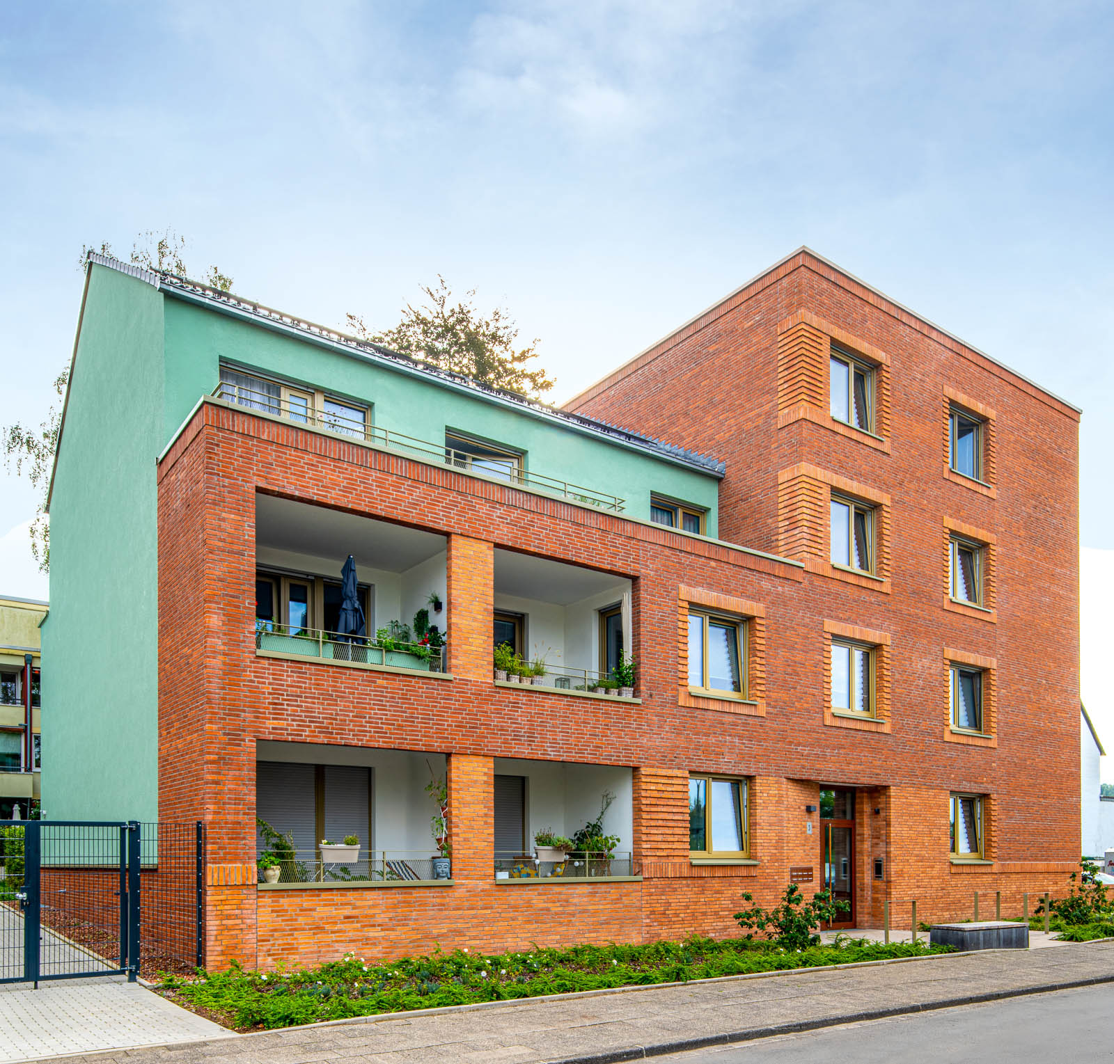 In einer aktuellen Meldung präsentiert das Architekturportal BauNetz unsere Wohnquartier in Düsseldorf: „An den Fassaden zur Straße arbeiteten die Architekt*innen mit einer zweischaligen Vollklinkerfassade mit porosierten Lochziegeln als Dämmung. Flache Erker und ein Staffelgeschoss gliedern die Straßenansicht plastisch. Hinzu kommen auffällige Streifenreliefs sowie changierende Farben der Klinker.“
