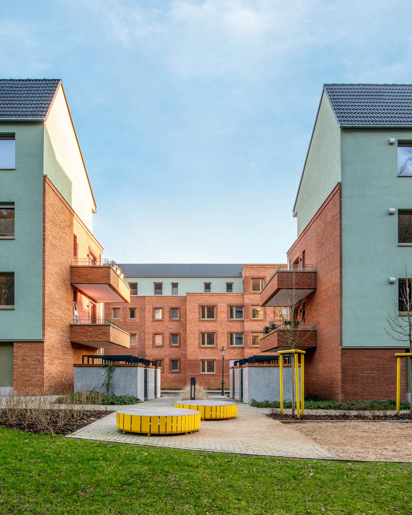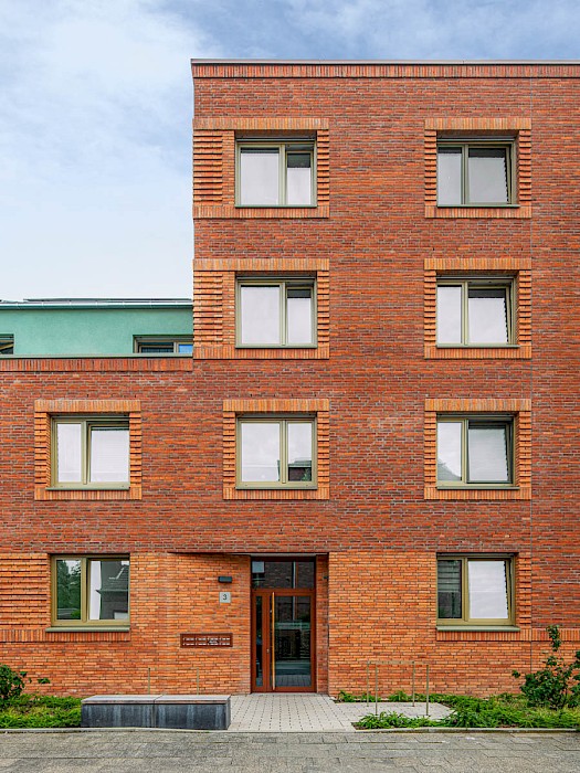 Unser Entwurf folgt einer einfachen Idee: Die Tradition des genossenschaftlichen Wohnungsbaus zeitgemäß fortzuführen – als klassische Wohnanlage mit klarer städtebaulicher Setzung und einheitlicher Architektursprache. Markante Kopfbauten, plastisch gegliederte Straßenfronten und rötlich-sandfarbene Klinker verleihen dem Quartier einen vertrauten, identitätsstiftenden Charakter.