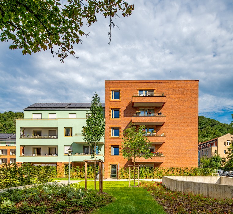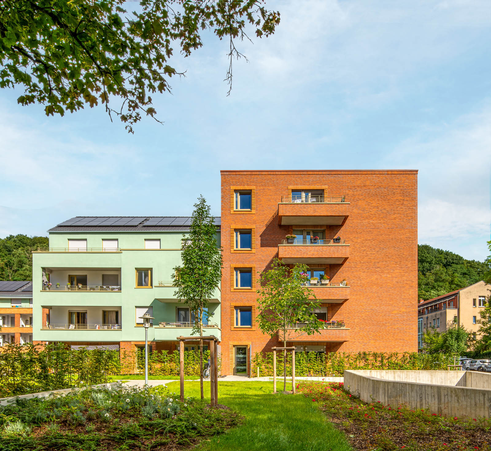 Ein Quartier mit Vorbildcharakter: städtebaulich eingebunden, sozial offen und ressourcenschonend konzipiert. Die knapp 200 Meter lange Gebäudestruktur ist so gegliedert, dass Grünflächen, Spielplätze und gemeinschaftliche Einrichtungen für alle zugänglich sind. Das genossenschaftliche Trägermodell sichert zugleich langfristig bezahlbaren und selbstbestimmten Wohnraum.