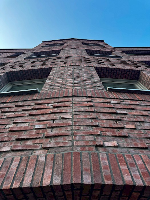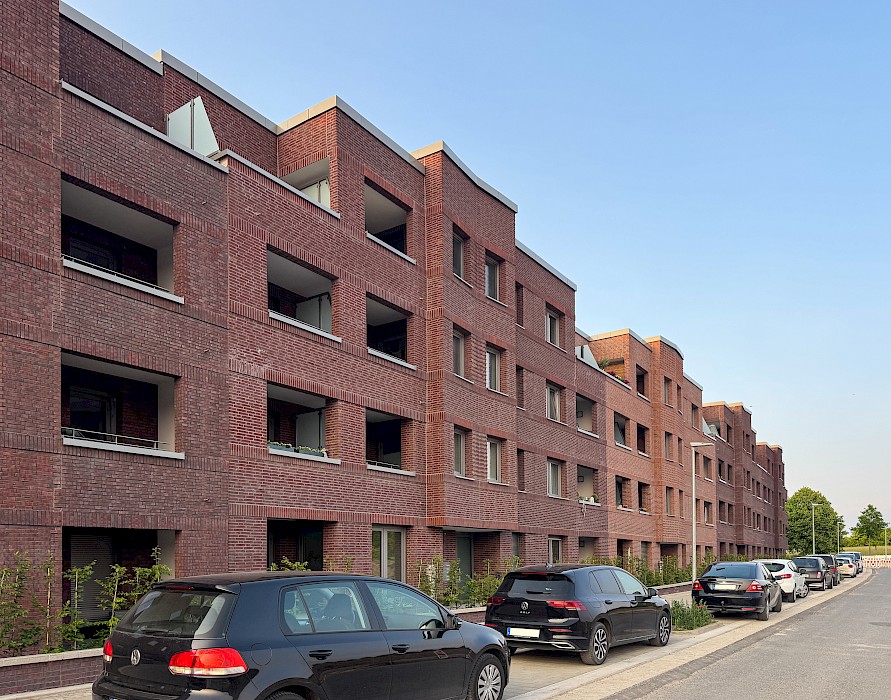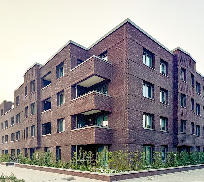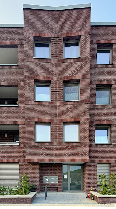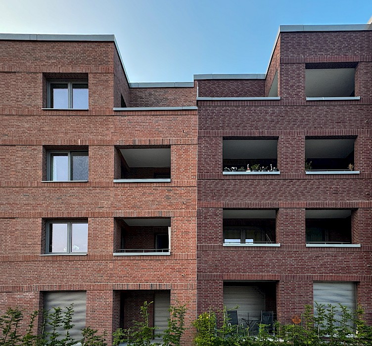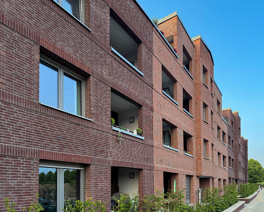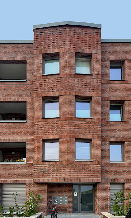 A common design element in the block is the clinker brick façade, in different shades of red. This also fits in with the colour concept for Kronsberg-Süd and echoes local building traditions. As well as the varying colours of the clinker brick, the individual buildings are distinguished by differently designed projecting and recessed sections and in the treatment of the corners and end sections. Particular care is taken with the sculptured modulation of the façades, featuring projecting and recessed sections, clinker-brick relief detail, brick-on-end courses and cornices. All the buildings are accessed direct from the street via a small forecourt in the front-garden zone, where there are also benches and spaces to park bicycles. The inner courtyard, which is at the level of the raised ground floor, has a central landscaped area for use by the residents. Within this area there are differently designed sections, planting schemes and spatial sequences. The lounges in the apartments all open onto this courtyard, with an outside space that is either a loggia, a balcony or a terrace. The townhouses on the west and north sides of the block each have a private garden as well as their own roof terrace. Two of the seven apartment buildings are intended for subsidised rental accommodation.