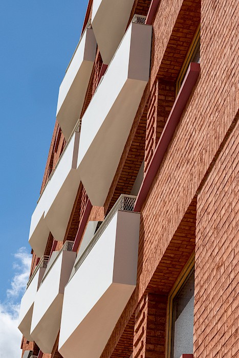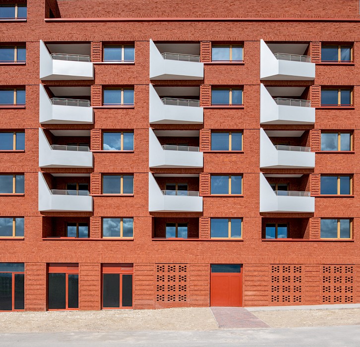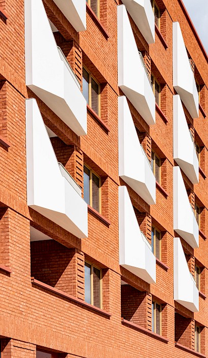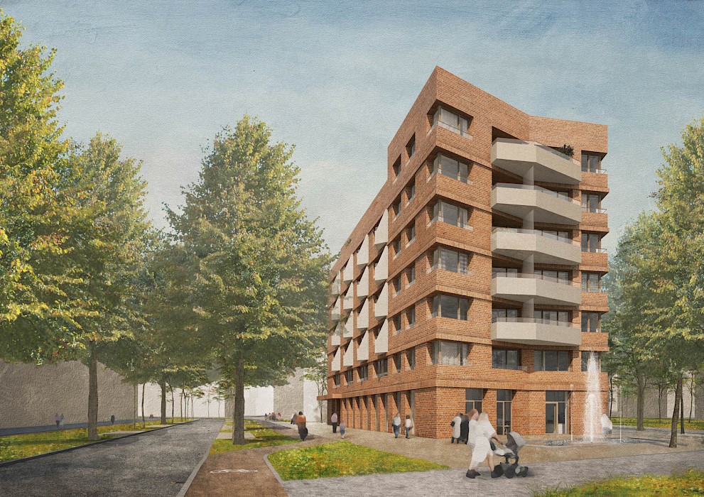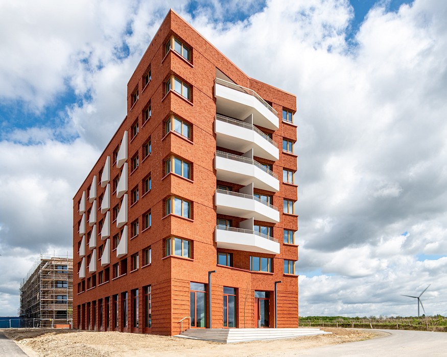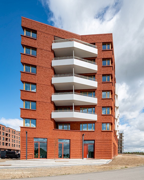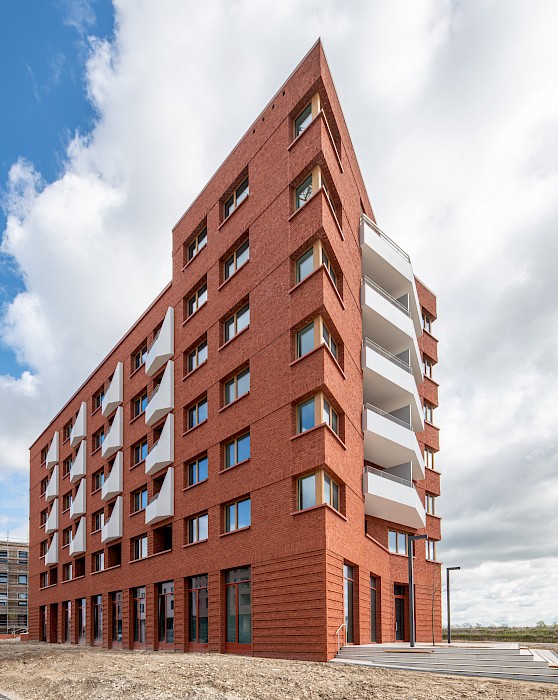 This residential and office building is to be completed in the coming years at the southern entrance to Kronsberg Süd, a new district that has its origins in the development plans laid down for EXPO 2000. The plot, triangular in shape with one blunted tip, is bordered on the south by a public square and to the north by a communal courtyard for the residents. The inwardly angled façade, and the contrasting loggia parapets of folded steel take up the motif of the triangle. The steel forms a deliberate contrast to the warm red clinker-brick façade which sculpturally modulates the building with its brick-on-edge courses and deep reveals. This clinker façade, and the colour design for the new district, echo local building traditions.