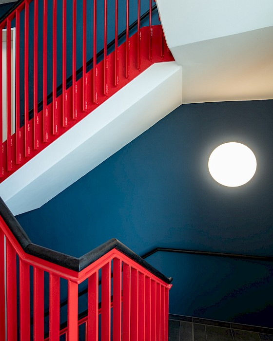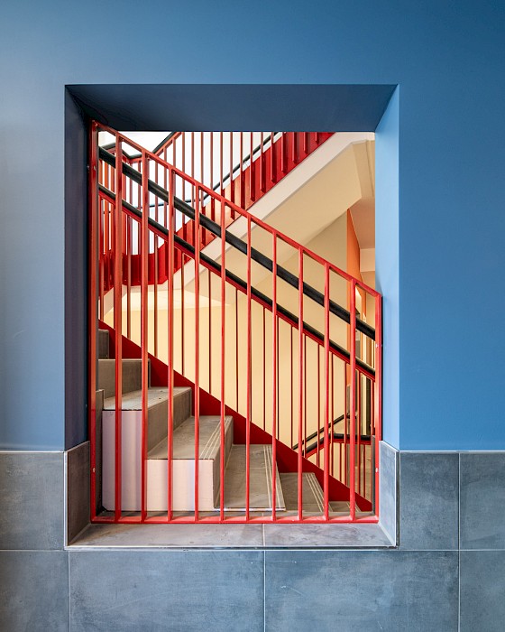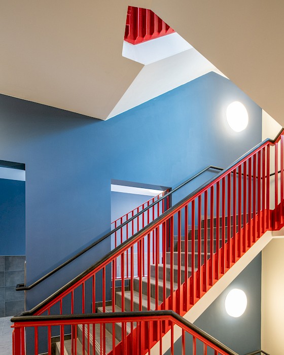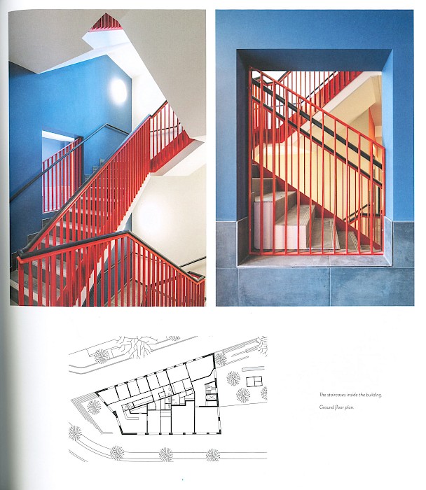 All the apartments have a private outside space in the form of a loggia or a terrace. Above the base storey, which accommodates three small-business units, are two- to four-roomed apartments with different ground plans. Both council-funded and independently financed apartments support the mixed use of the building.
