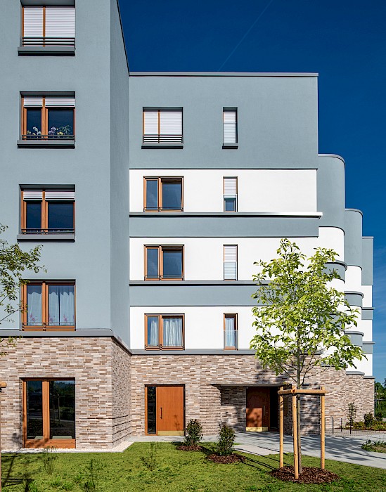 On behalf of the local housing association, Stefan Forster Architekten is building four residential blocks in the district of Nilkheim to the southwest of Aschaffenburg´s town centre. The Schopenhauerstrasse residential development comprises a group of three five-storey building volumes and a six-storey solitaire, these being arranged roughly along the arc of the street and marking the start of the new district of Anwandeweg. The position and outline of the new buildings derives directly from the requirements of the development plan. Along the street a mix of uses is envisaged, including commercial units and rows of shops, accordingly the ground floor apartments are oriented towards the south, to the garden. The façade is articulated by means of spacious openings picked out in light colours and base zones in quality clinker brick. Profiled clinker brick and cornices emphasise the horizontals. A mix of accommodation is provided, with differently dimensioned two- to four-roomed apartments, each of them having a dedicated outdoor space in the form of a loggia or a terrace. In total 108 subsidized rental and 16 freehold apartments are being built at Schopenhauerstrasse, ensuring a corresponding social mix in this new urban district. Local authority ownership ensures the provision of affordable accommodation long term.