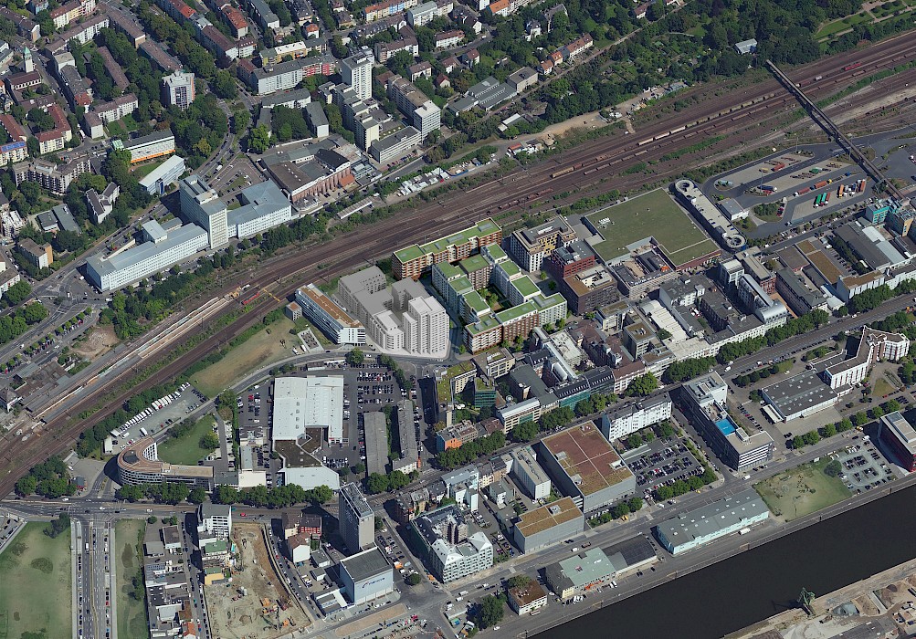 Aerial view from the south of the Schwedler Carré in the Ostend district of Frankfurt, Photo: Stadt Frankfurt
