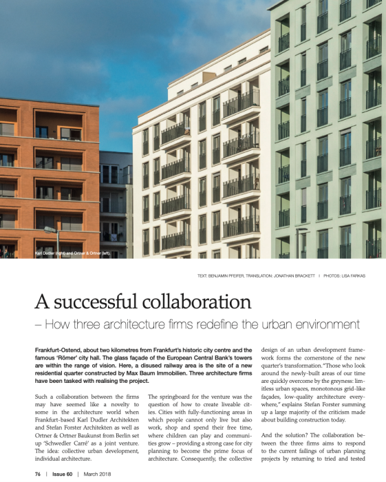 Unter dem Titel „Lob der Kooperation“ widmet sich das Architektur- und Lifestylemagazin Cube unserem – gemeinsam mit Karl Dudler Architekten und Ortner & Ortner Baukunst realisierten – Projekt Schwedler-Carré 01: „Im Frankfurter Ostend planen drei Architekturbüros Stadt“.