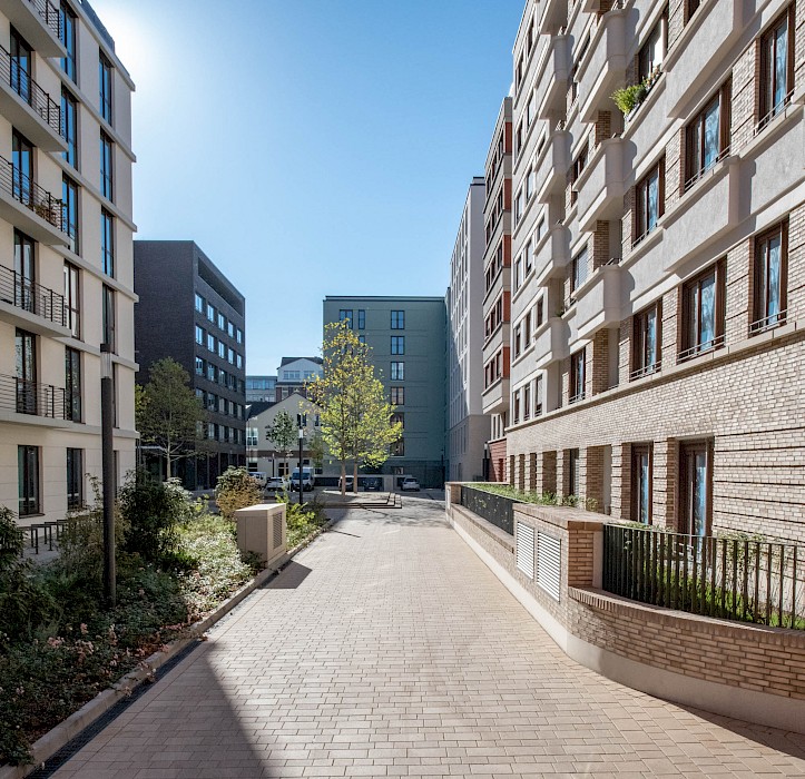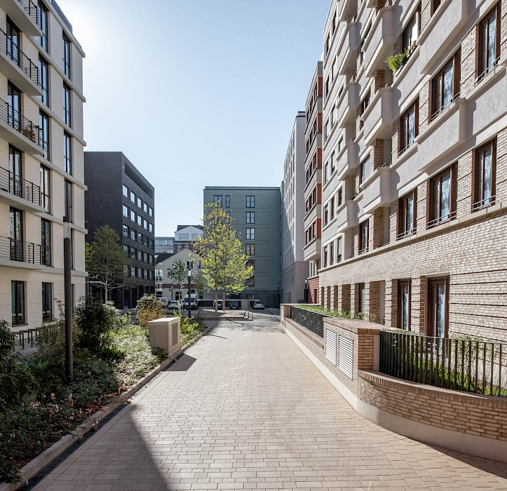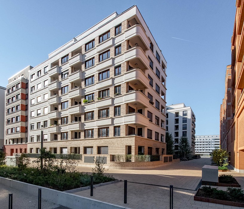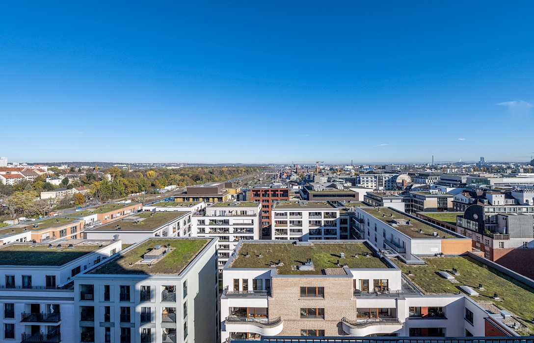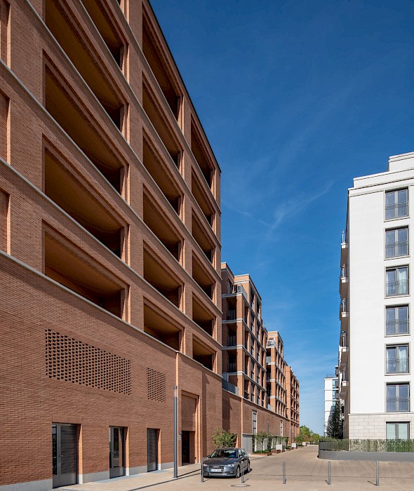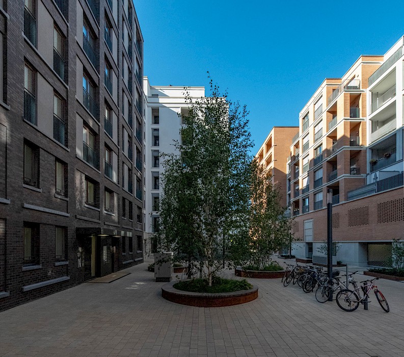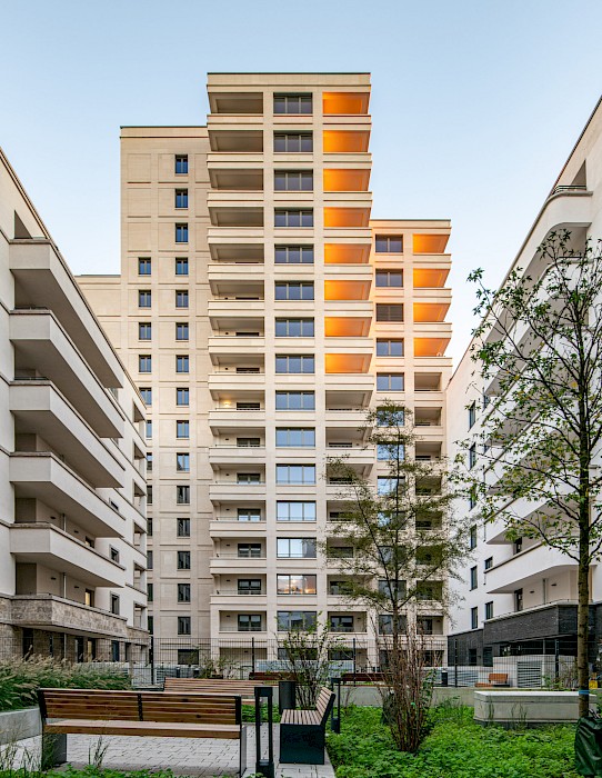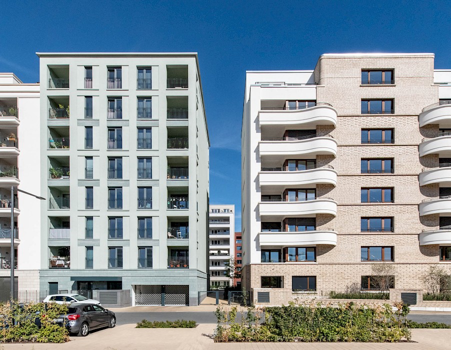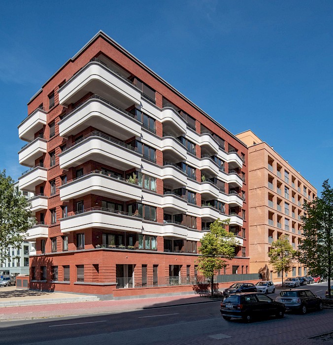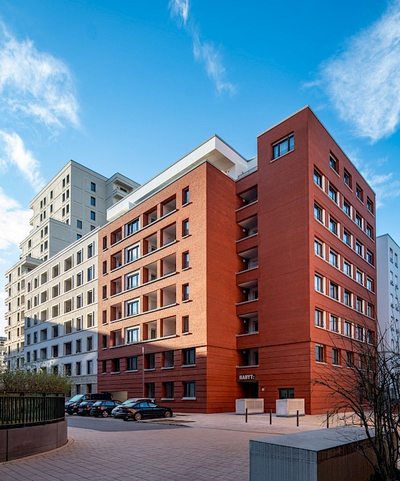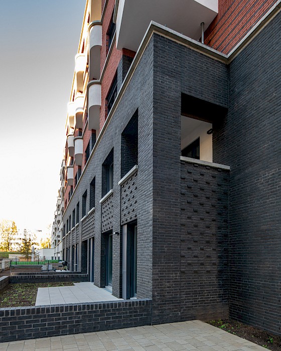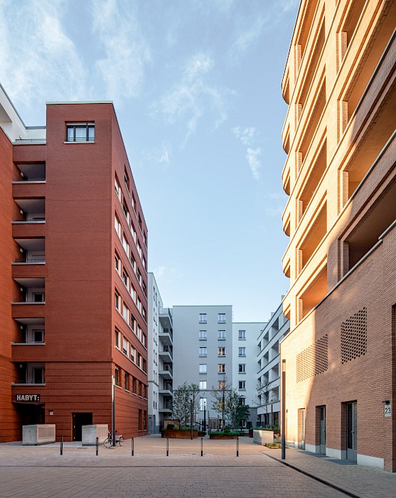 All the apartments have either their own private garden, for the ground floor, or a balcony or loggia, for the upper floors. The façades of the mostly seven-storey buildings by Stefan Forster Architekten are characterised by a substantial ground floor and the use of contrasting coloured clinker. The 16-storey high-rise on the southwest corner marks the entrance to the district. Together with the rental and freehold apartments, Schwedler Carré is developing into a socially mixed district with a variety of communal outdoor spaces.
