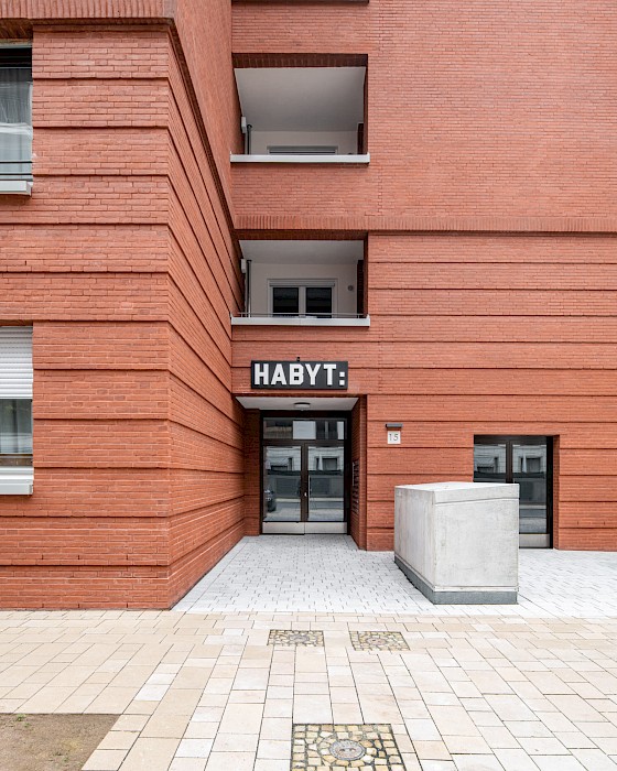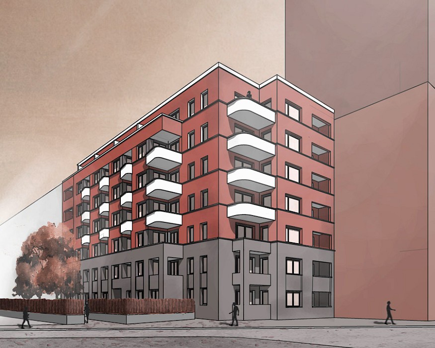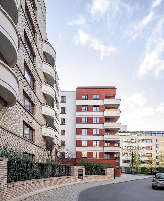 The corner to Gref-Völsing-Strasse emphasised by an all-clinker façade in an earthy shade of red