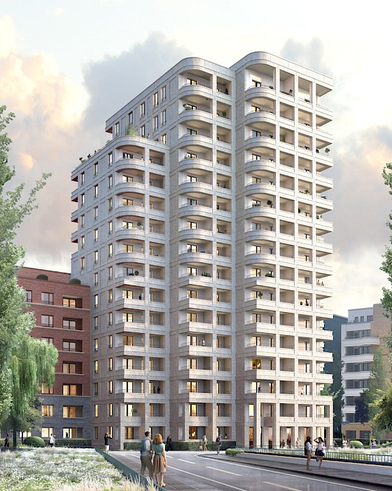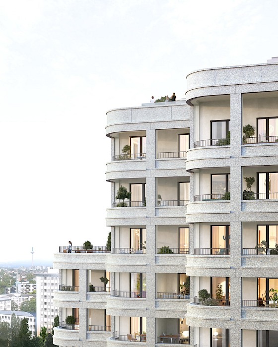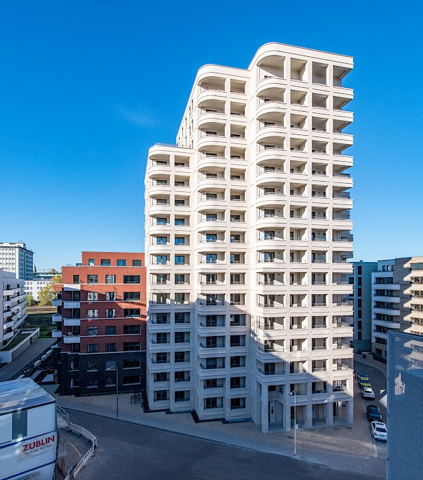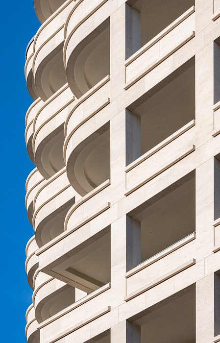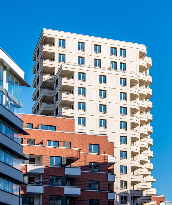 Das Wohnhochhaus „Drei Horizonte“, entworfen vom Architekturbüro ARGE Schwedler Trio (Karl Dudler, Stefan Forster, O&O Baukunst Architekten), ist aus Kalkstein gefertigt. Die Ausführung erfolgte durch das Natursteinunternehmen Hofmann Naturstein GmbH & Co. KG.