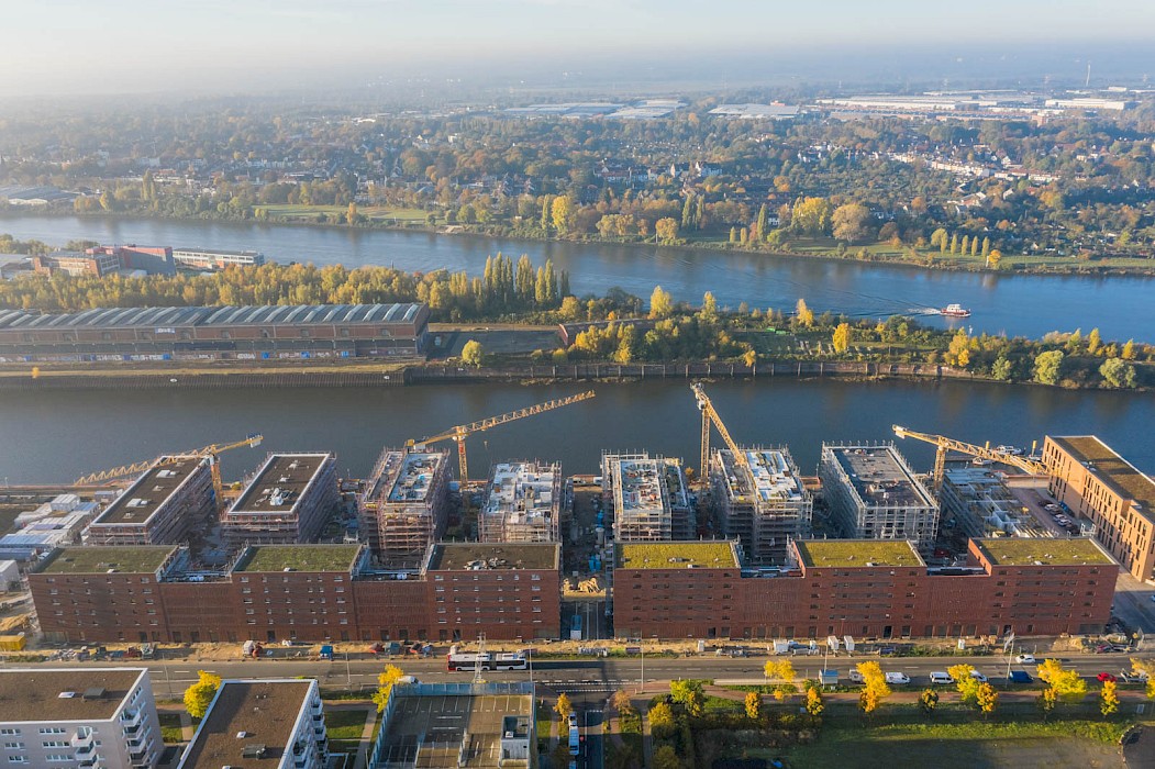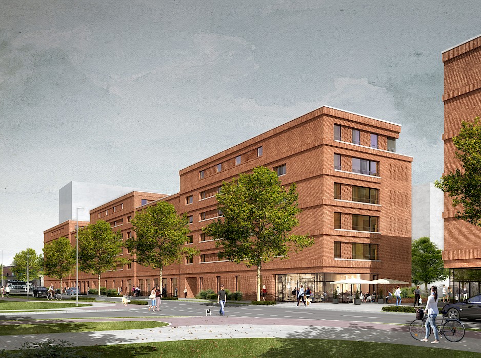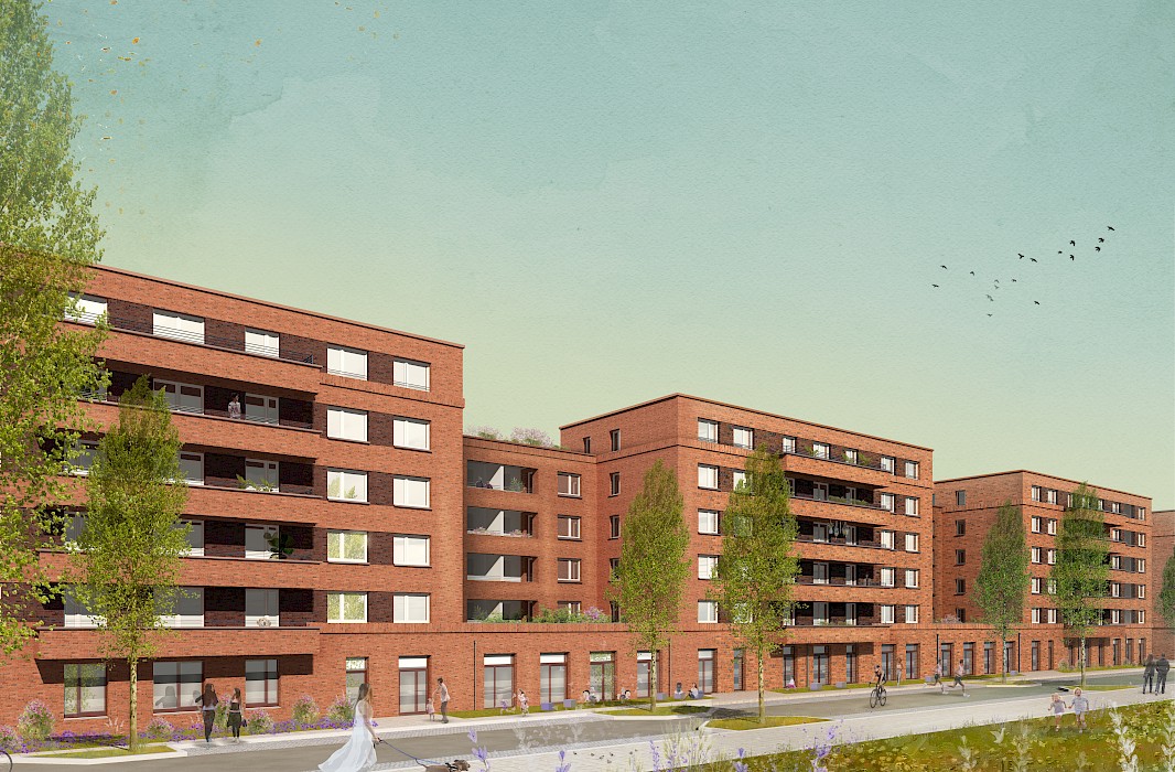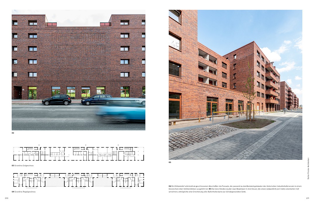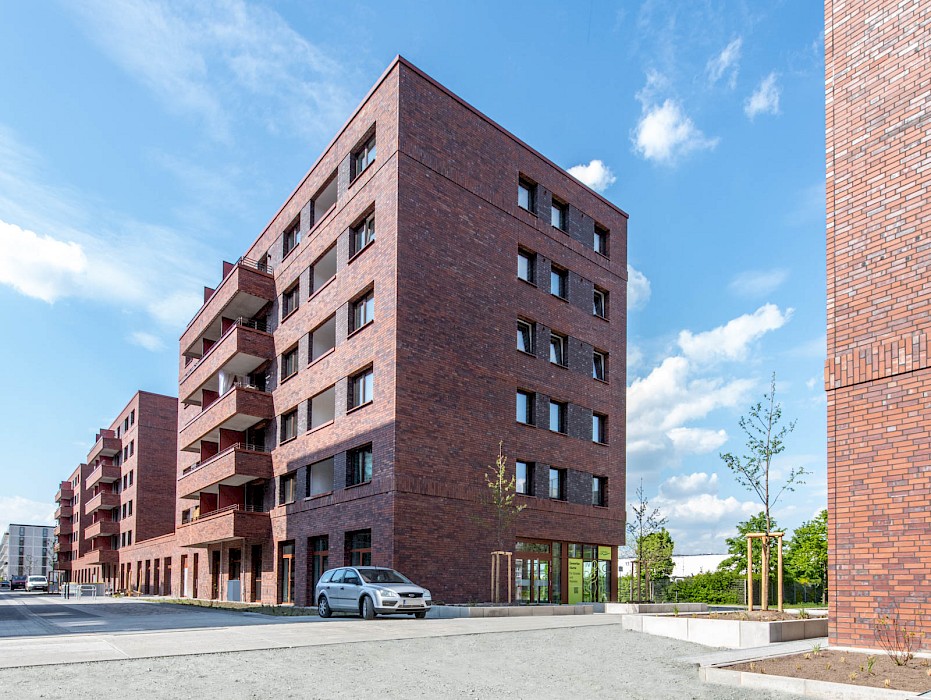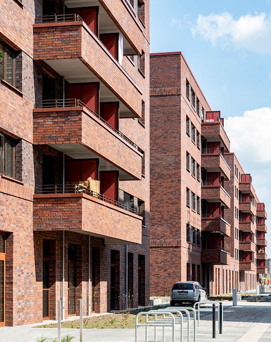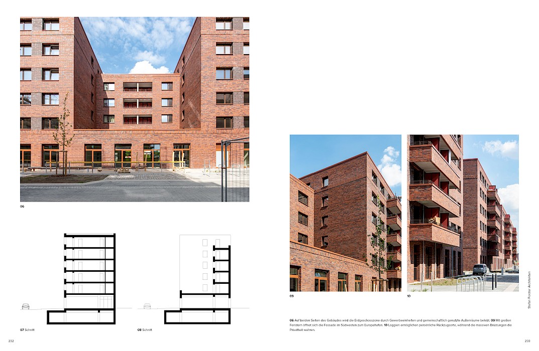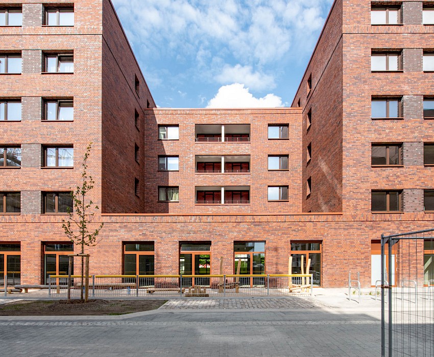 Für den Entwurf von zwei Gebäudezeilen in der Überseestadt in Bremen wurden Stefan Forster Architekten mit dem 1. Preis in einem Realisierungswettbewerb für geförderten Wohnungsbau ausgezeichnet. Die Klinkerbauten sind plastisch gegliedert und verfügen über je zwei Höfe.