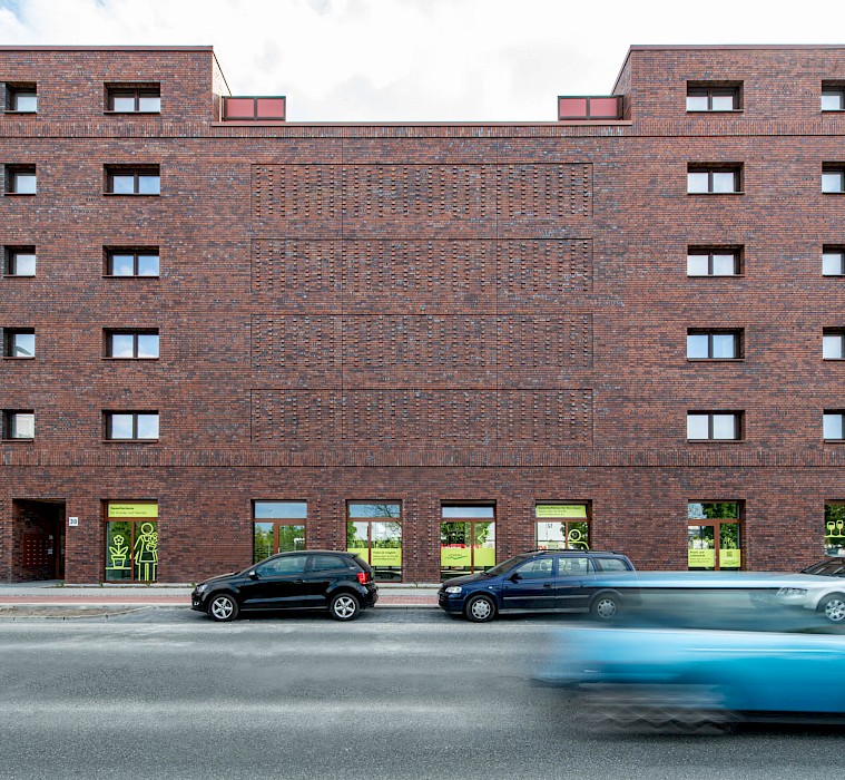 The design solves these problems by dividing the building volume into two blocks, with gable ends that bring additional light into the larger apartments and generate courtyards in the spaces in between. Another effect of this figure is the structural articulation of the volume towards the outside, which lends an attractive rhythm along the street. In a nod to the architectural tradition of Bremen, famous for its clinker brick ornamentation, the façade features a warm shade of clinker brick and distinctive relief modulation. In the interior, too, attention is paid to delivering good quality accommodation (all the apartments are for social housing tenants) with generously sized open spaces in the form of loggias and terraces.