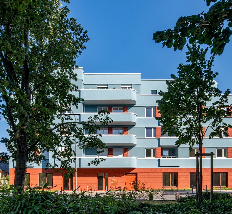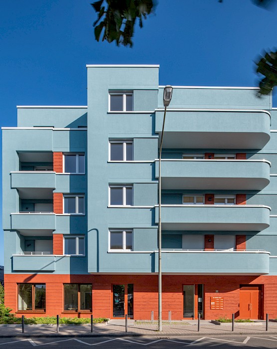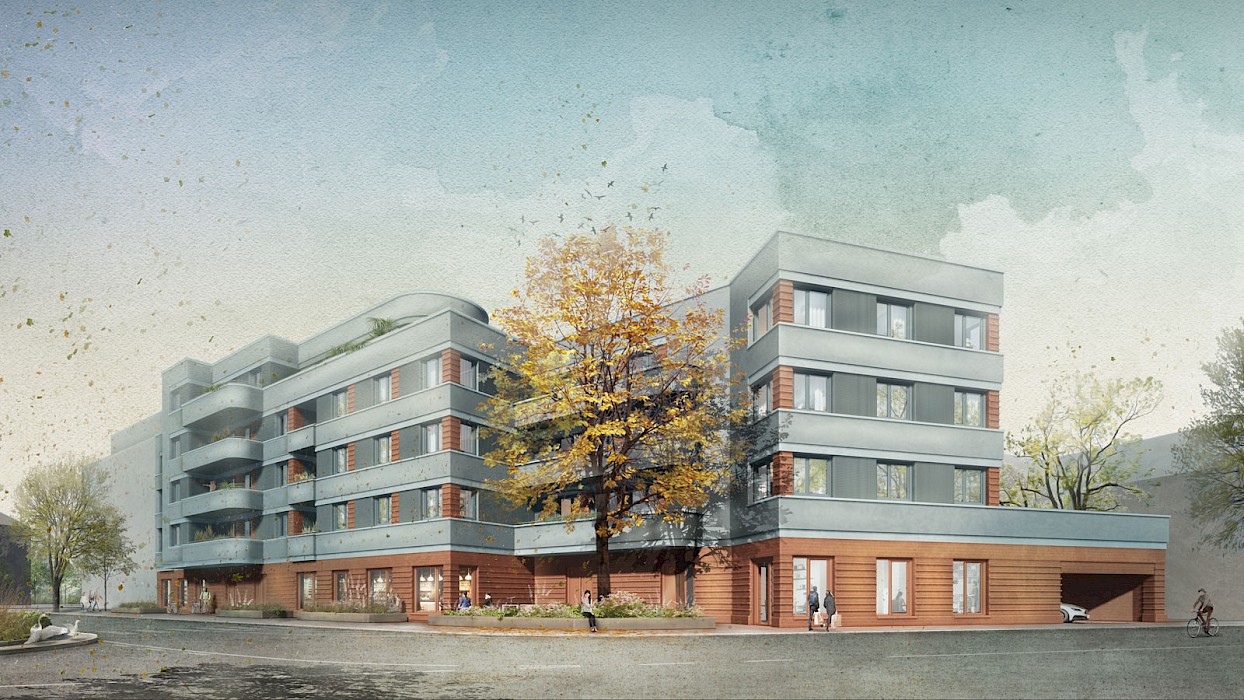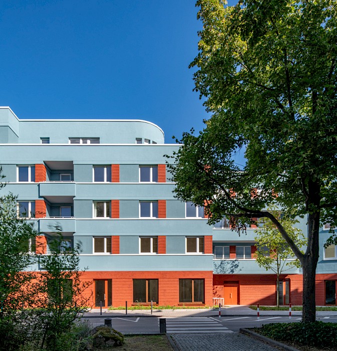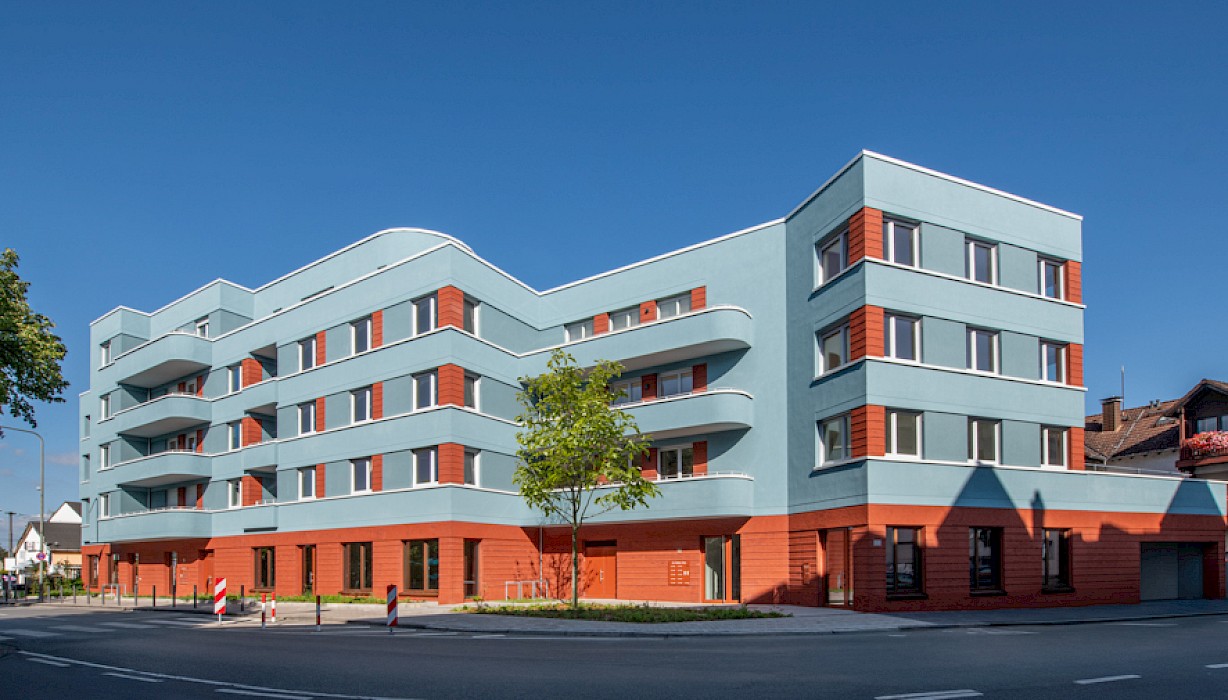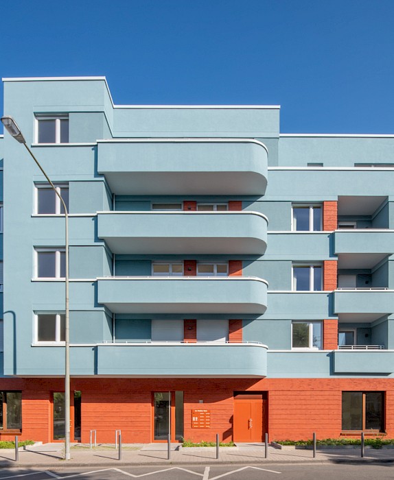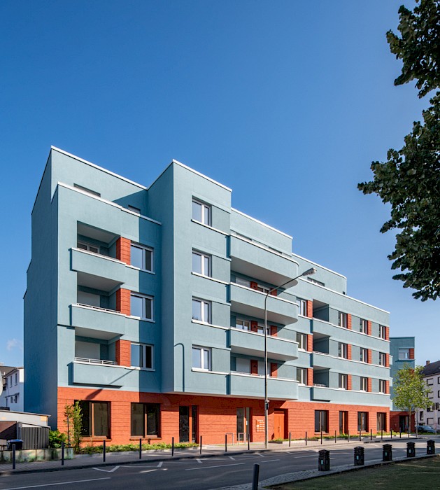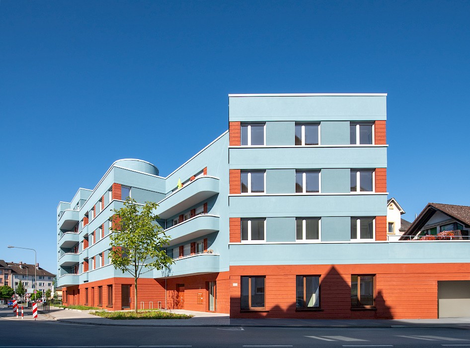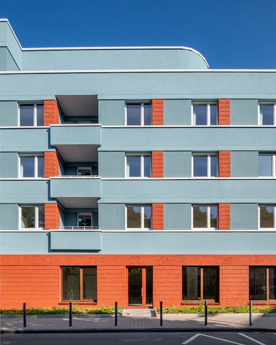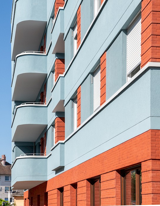 The “Weißer Stein” project occupies a prominent position on the square of the same name in the centre of the Eschersheim district of Frankfurt. The linear building, angled at the western end, follows the line of the street and forms the northern edge of the triangular square. It replaces a two-storey building (with a 1-euro shop on the ground floor) and a 1970s warehouse. With the garages at the back and the open ramp leading down to the underground car park, the site was very underused and closed off from the square by a partly continuous wall. In contrast to these pre-existing structures, the new development, designed for the client Homes Development, responds to the spatial situation of the street and the square. It features a high-quality clinker-brick base storey, a horizontally articulated rendered façade with colour-differentiated parapet bands and a mix of volumes, all of which enhance the public space.
