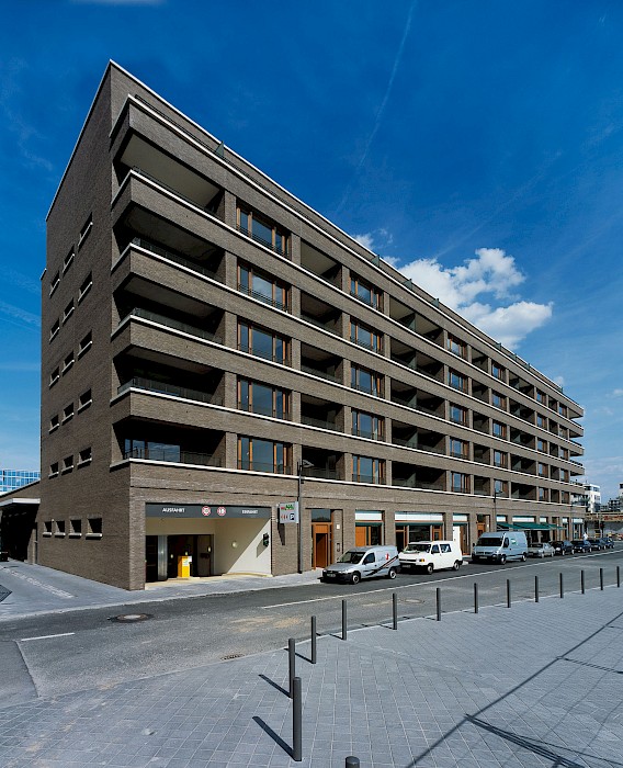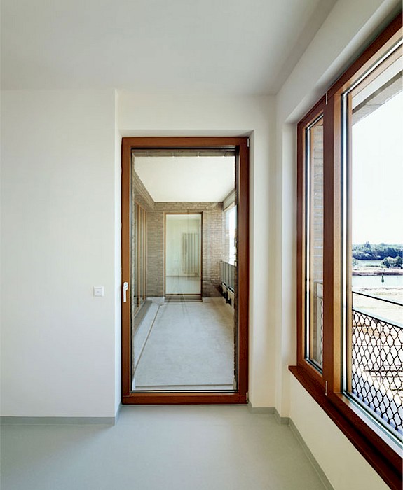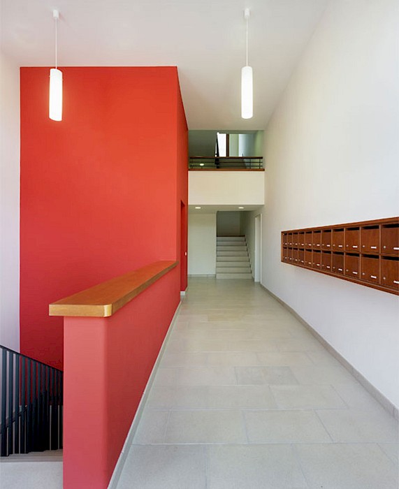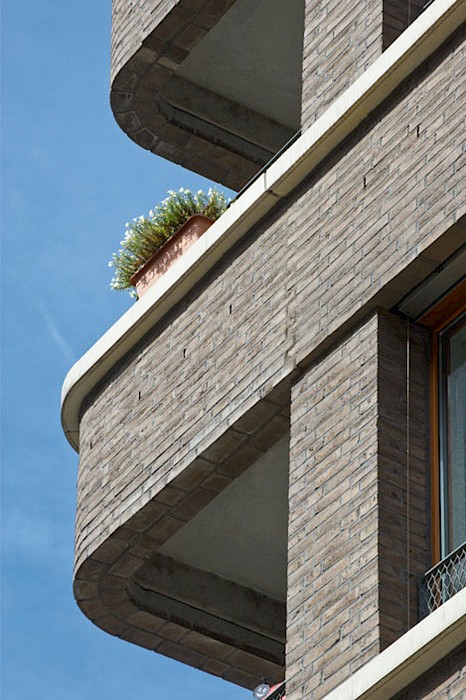 In this context Westgarten 01 can be regarded as a programmatic formulation of the architectural qualities of an urban apartment building. First the building volume itself is seen as a clearly articulated geometric volume which dispenses with projecting sections such as canopies and balconies. In plan the building precisely traces the edge of the city block, and, together with neighbouring buildings, forms a continuous line of development. Special attention was paid to the design of the street façade with horizontal bands of warm-brown