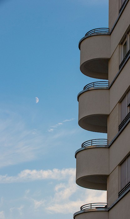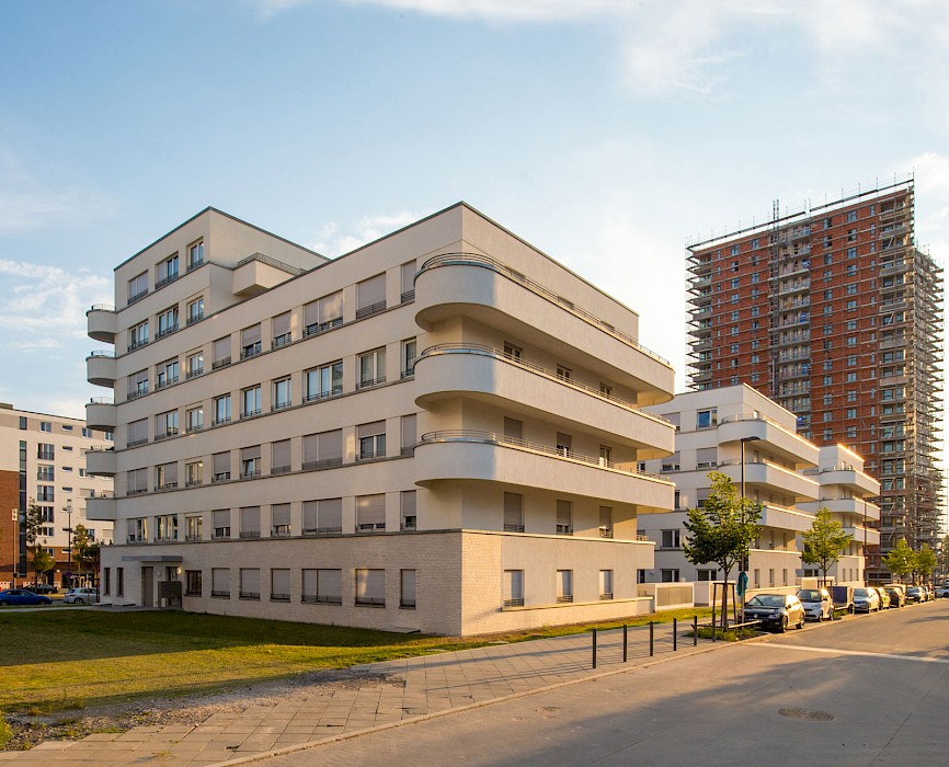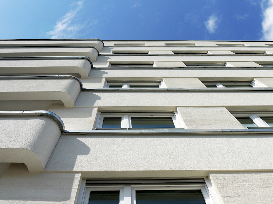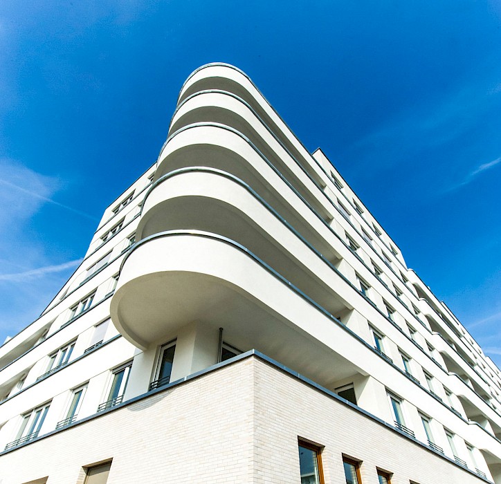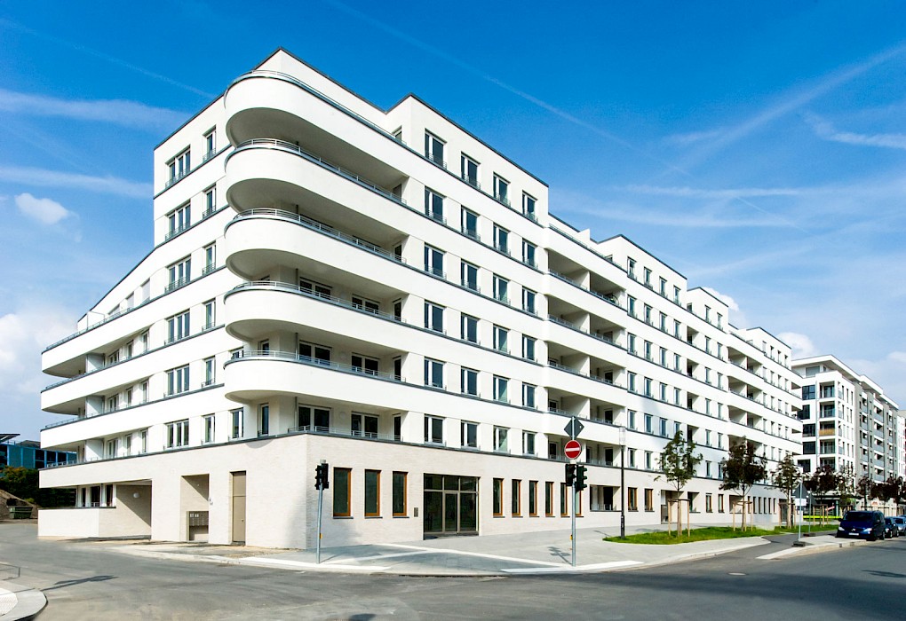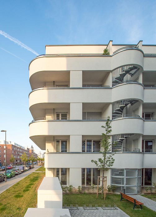 With the conversion of the old main rail freight depot and the area of tracks adjacent to it, Frankfurt am Main had the opportunity of creating a new urban district here in a very central location. The name finally settled upon was “Europaviertel”. In the western part of this new district is this seven-storey residential block with retail facilities at ground-floor level. Towards Pariser Strasse, at the rear of the plot, the building divides up into a comb-like structure with three five-floor “fingers” forming two inner courtyards in the spaces in between. The apartments – 75 in total – are accessed via three stairwells. The façade is divided classically into a base, a central and an upper part and structured horizontally by slightly projecting loggias. At the ends of the building the loggias are continued around the edges to form a distinctive semi-circular wrap-around feature.