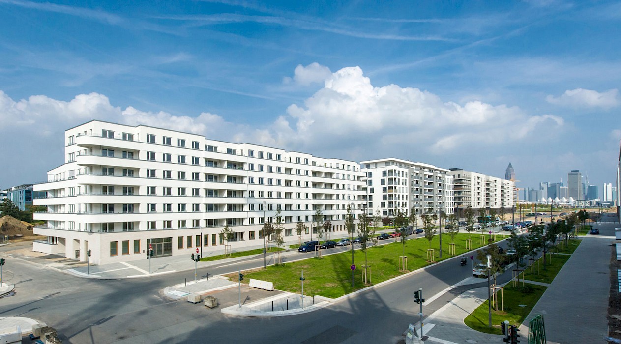 In schnellen Schritten wächst das Europaviertel westlich des Hauptbahnhofes zu einem neuen urbanen Quartier in Frankfurt. Entlang der Europaallee, der zentralen Achse des Konversionsgebietes, werden derzeit 75 Wohnungen und zwei Ladeneinheiten im Erdgeschoss realisiert. Der Rohbau des Projekts Europaviertel E3 ist bereit fertiggestellt; erste Mieter können ab Mitte 2014 einziehen.