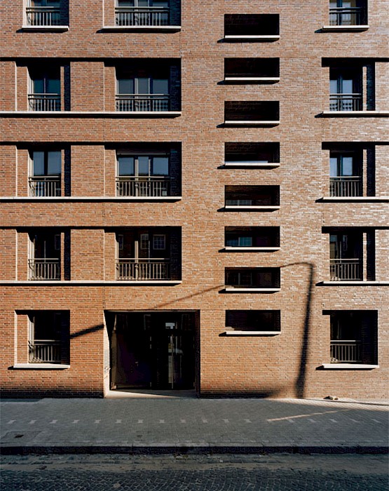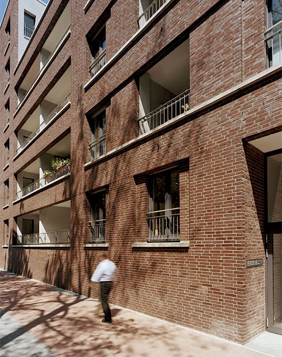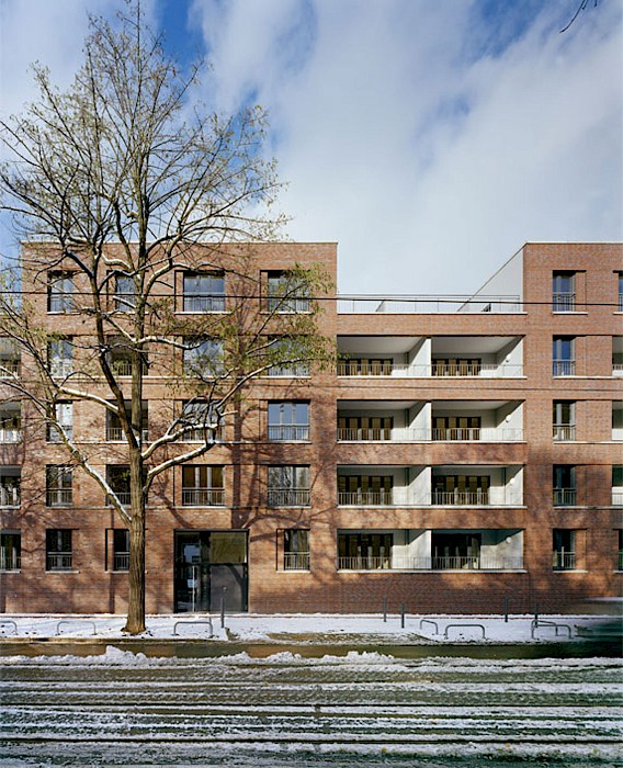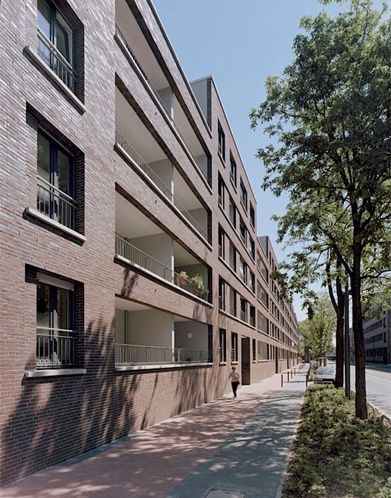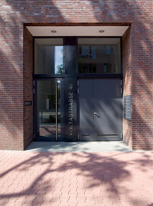 Replacing this, the new development, called the “Wohnanlage Voltastraße”, takes up the planning idea of the new urban borderline and interprets this architecturally as a large 120-meter long block in an extended U-shape. The references to the large-scale urban housing of the 1920s are clear, references that were later developed further in the Schwarzwaldblock. The building volume consists principally of two parts: On Galvanistraße is the symmetrically designed six-storey end section, sculpturally articulated with a projecting central risalit and side balconies. The long sides are lower, with four to five storeys, and devoid of any cantilevered or projecting components. A sculptural effect here is achieved instead through the rhythm of the elements incised into the façade: Pairs of connected loggias, generously sized entrances and roof terraces cut into the roof line in segments. The deliberate restriction to red-brown clinker brick emphasises the unity of the whole complex and refers to the historic factory architecture of the former industrial site. Contrasting with the precisely articulated street fronts is the communal character of the large, green inner courtyard. A direct connection between the street and the courtyard is provided by the entrance areas which go through from front to back.