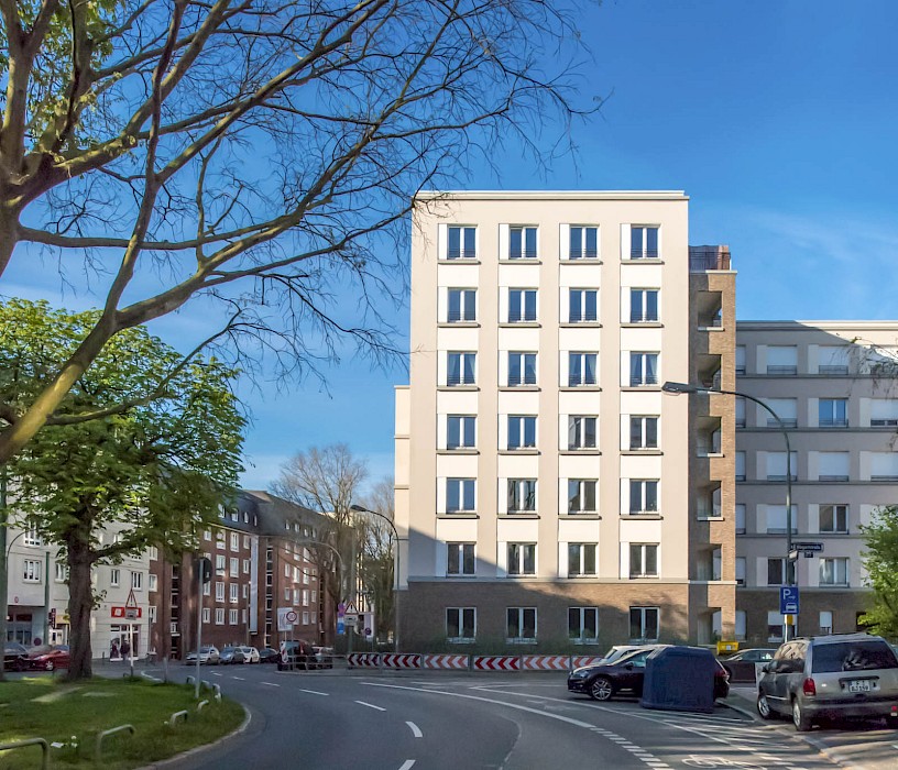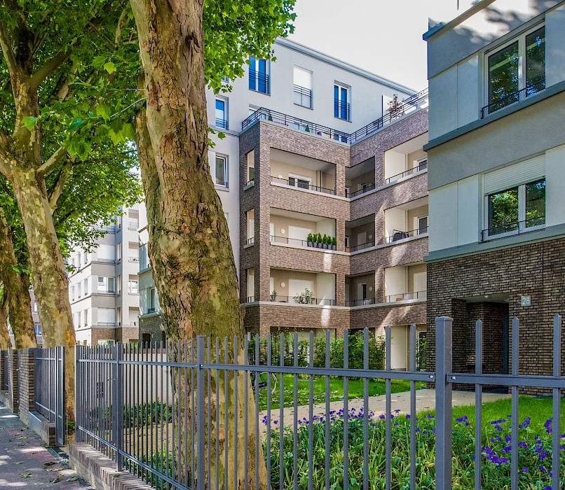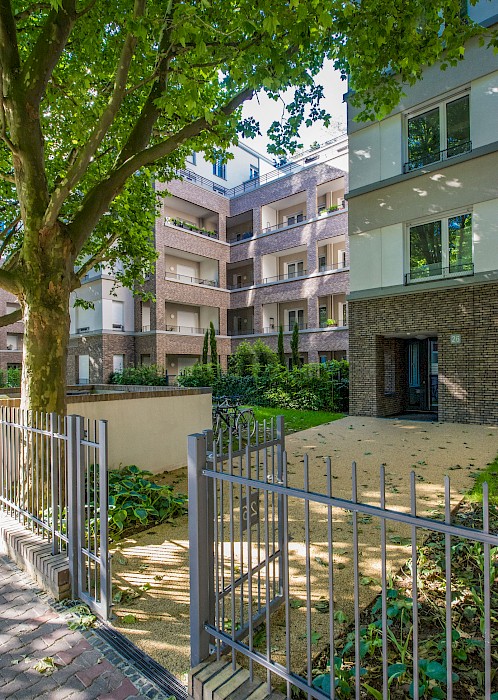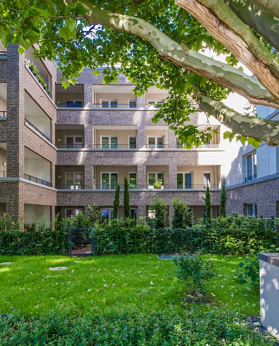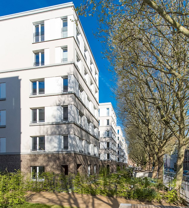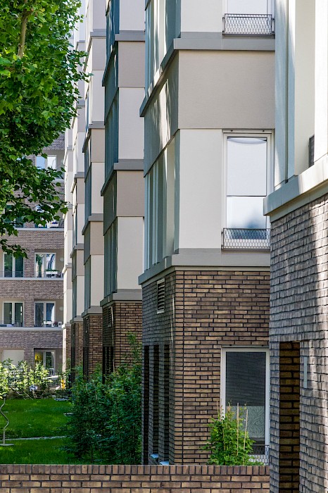 The principle of a “comb-like” structure, or indented outline projecting into the surrounding space, underlies not only the plan of the building, but also its height development. At six floors in height, the crosswise sections rise above the linear tract by one storey, a device that gives a distinctive rhythm to the whole complex, while also creating space for the terraces of the roof-top apartments. In the east, at the junction of Wingertstraße and Wittelsbacherallee, the edge of the block is conventionally finished off with a seven-storey corner building. The recurring element of the continuous clinker base storey emphasises the coherence of the residential complex. Half of the apartments are rental, the other half freehold; most of them are dual-aspect and, depending on their exact position, they have a generous garden, a loggia or a terrace.