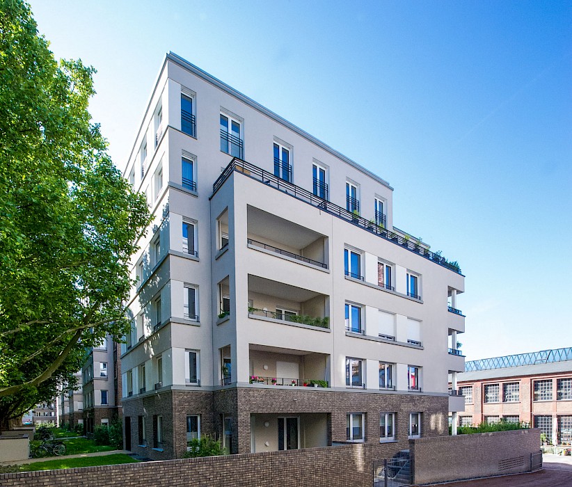 The story of “Naxos” goes back to the 19th century. In 1871, on the site between Sandweg and Wittelsbacheralle in Frankfurt’s Ostend district, Naxos-Union built a factory to manufacture grinding machines. Over 100 years later the factory shut down after the company was sold to the Rothenberger Group and operations were moved to another site at the end of the 1980s. For years the site remained unused until 1999 when the City of Frankfurt purchased sections of it. In 2006 the City also bought the main factory building, which was a listed structure. This hall, called Naxoshalle, is the only remaining relic of the former industrial complex. Today it is the home of the Willy Praml theatre company. In 2008, the ancillary halls to the north and east then became the subject of an architectural competition organised by the local housing association, ABG Frankfurt Holding. The aim was to build around 180 apartments in place of the halls – two-thirds of them for ABG in the northern part, and one-third for a group of six smaller housing associations in the eastern part.