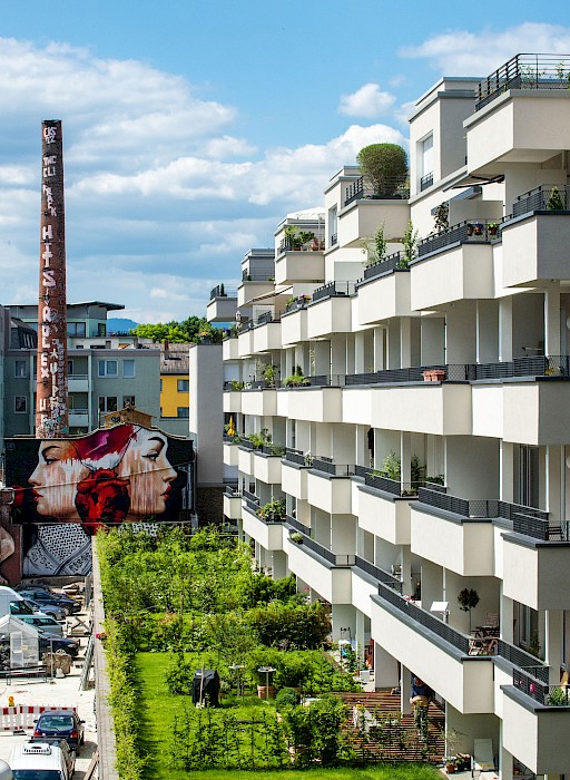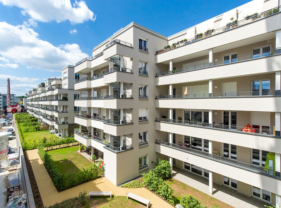 The indented line of the building, with six tracts piercing the linear structure at right angles, loosens up the street face and enables maximum exploitation of daylight. The courtyards between these tracts contain the private gardens of the ground-floor apartments. Oriented towards Naxoshalle, the rear of the complex features continuous balconies and loggias, echoing the horizontality of the hall.