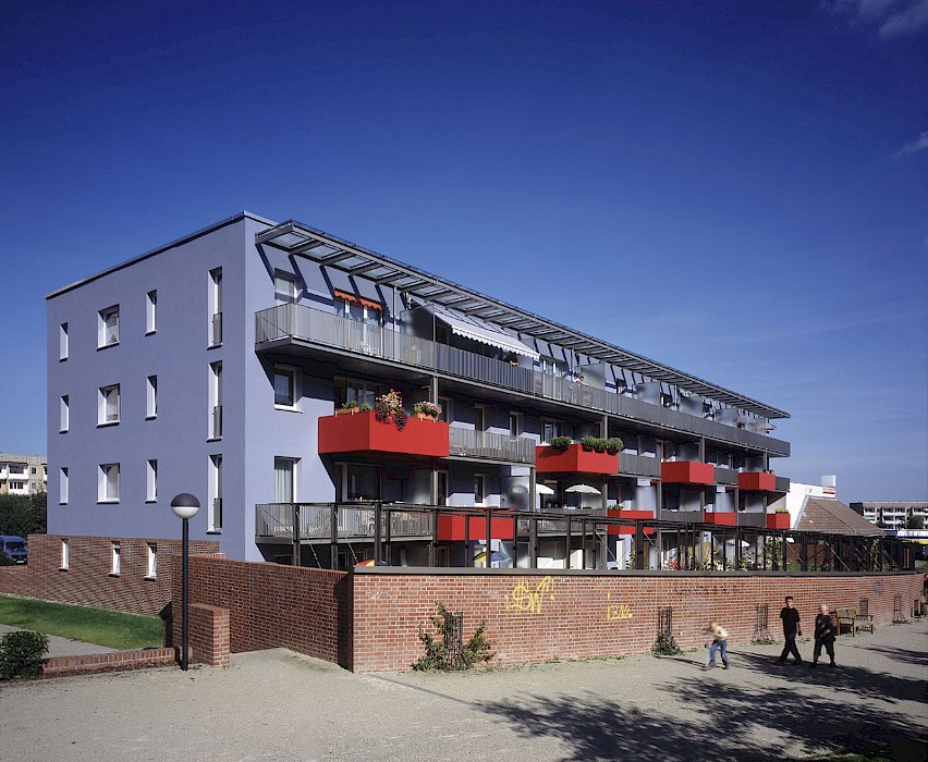 Die bereits beim Projekt Haus 02 entwickelten Prinzipien der Plattenbautransformation werden hier erneut angewendet und variiert: das Gebäude wird entsprechend von sechs auf vier Geschosse zurückgebaut, was eine Reduktion der Wohnungsanzahl je Treppenhaus zur Folge hat; der umlaufende Mauerwerkssockel fasst Haus und Außenbereiche optisch zusammen. Aus einem einzigen, standardisierten Grundriss wird eine Vielzahl unterschiedlicher Typen entwickelt. Zur Straßenseite hin werden die Einfriedungen im Vergleich tiefer angelegt, wodurch sich ein markanter Rhythmus durch die Unterbrechungen der Hauseingänge ergibt. Dieser wird durch kompakte Balkone in der Achse der Eingänge aufgenommen. Die Erdgeschosswohnungen verfügen über großzügige, von außen blickgeschützte Gärten über denen ein Cluster unterschiedlich gestalteter und dimensionierter Balkone die Fassade strukturiert.