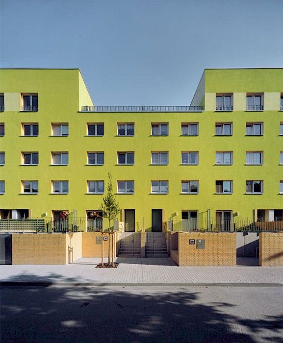 Durch den segmentweisen Rückbau erhält Haus 08 eine plastische Gliederung, auf der Rückseite verstärkt durch abgetreppte, großzügige Dachterrassen. Die Erdgeschosswohnungen erhielten zu beiden Seiten Privatgärten. Besondere Sorgfalt wurde auf die Differenzierung und Neufassung der Außenbereiche gelegt. Eine umlaufende helle Klinkermauer definiert den öffentlichen Straßenraum und bildet durch Vor- und Rücksprünge kleine Vorhöfe und geschützte Eingangsbereiche mit Sitznischen aus. In den Zwischenbereichen befinden sich private Vorgärten. Durch die Aufschüttung des Geländes sind die Gärten der Ergeschosswohnungen zu beiden Seiten barrierefrei erreichbar. Zudem unterstreicht die Farbgebung die Differenzierung zwischen einer strengen Vorder- und einer informellen Rückseite, die über durchlaufende Balkone und Terrassen zum Grünraum orientiert ist.