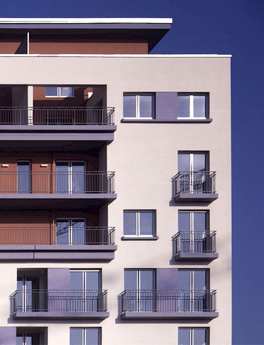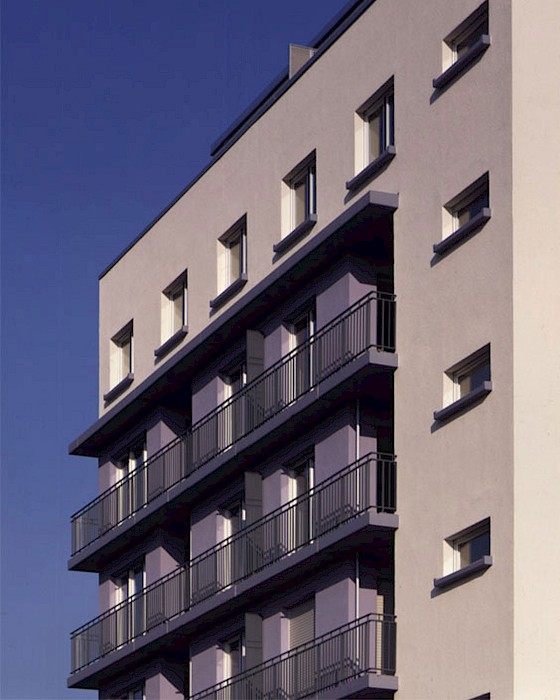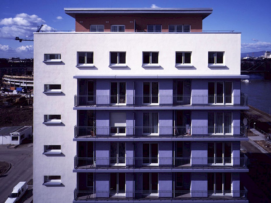 Als zweites von insgesamt elf Häusern gab dieser Solitär den Auftakt zur Bebauung des neuen Deutschherrnviertels am südlichen Mainufer in den 1990er-Jahren. Der privilegierten Lage am Fluss folgt die Differenzierung der Fassaden, die nach Norden, zur Stadt hin, eine strenge, symmetrische Ordnung aufweist, nach Süden jedoch mit einer spielerischen Anordnung unterschiedlich dimensionierter Balkone und Loggien Individualität ausdrückt. Die Ost- und Westseite verfügt über asymmetrisch angeordnete und zu Galerien zusammen gefasste französische Balkone. Das architektonische Programm beschränkt sich auf wenige, konsequent eingesetzte Mittel, ergänzt um ein abgestimmtes Farbkonzept. Der klare, kubische Baukörper verfügt über acht Regelgeschosse und schließt mit einem eingerückten Dachgeschoss mit allseitigem Dachüberstand ab. Es sind vor allem hochwertige Eigentumswohnungen entstanden.
